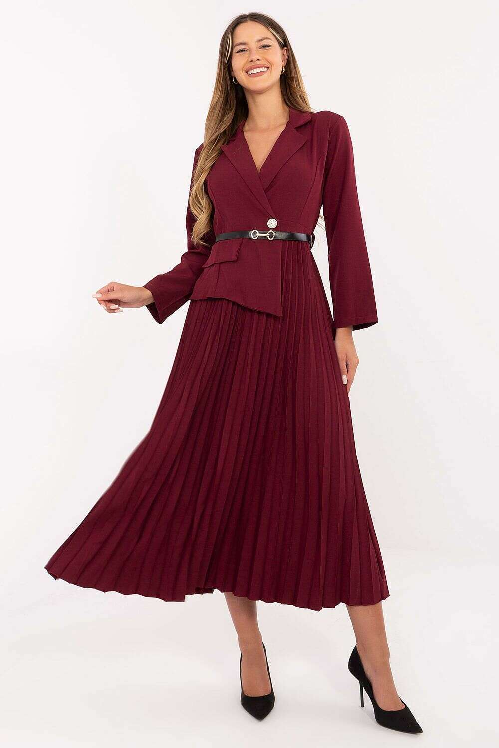 An elegant maxi dress with a flared cut, perfect for both work and formal occasions. The top in a sailor style with a classic collar and button fastening adds sophistication and a professional character to the whole look. From the waist down, the dress is made of pleated material that beautifully flows in movement, emphasizing lightness and feminine charm. Long sleeves add elegance, and a fastened belt accentuates the waist and gives the silhouette proportions. The whole piece is finished in a smooth manner, and the dominant blend of viscose and polyester ensures comfort and durability of the material.