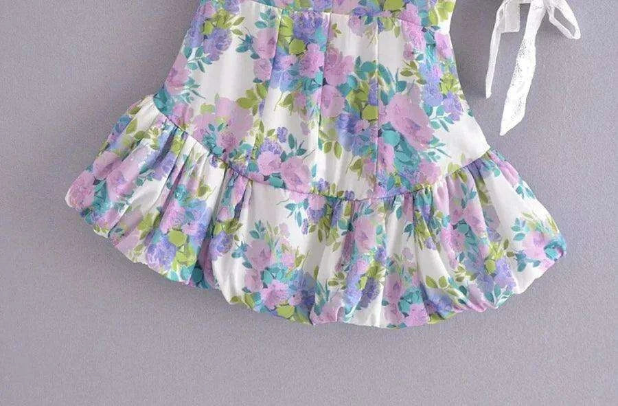Eclectic Elegance: Lace-Trim Asymmetrical Puff Sleeve Boho Dress..