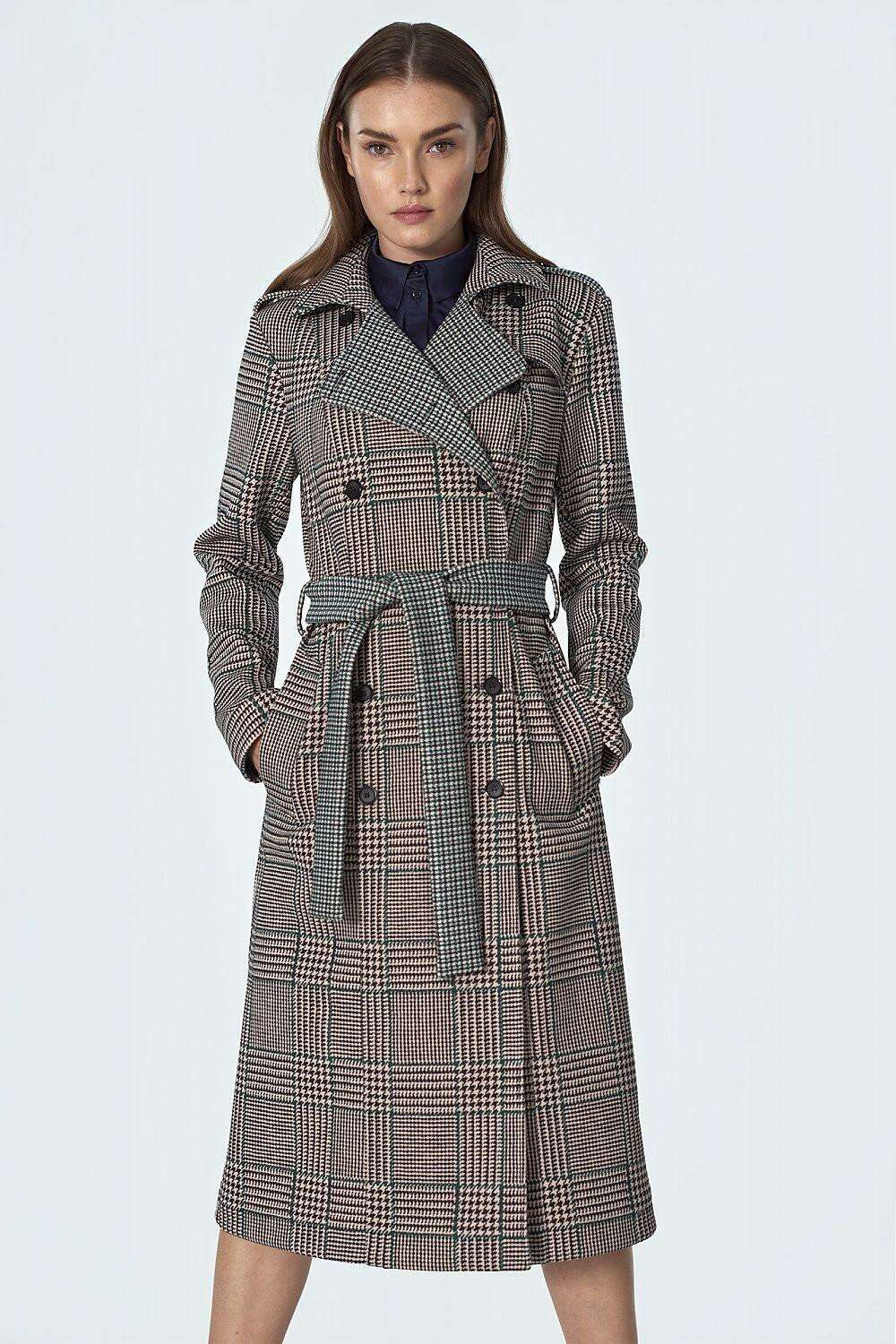Introducing the Elegant Checked Waist-Cinching Coat, a timeless piece that blends elegance with contemporary style. This waist-defining overcoat is an essential addition to your wardrobe, designed to elevate any outfit—whether you pair it with tailored workwear, casual knitwear, or evening attire.