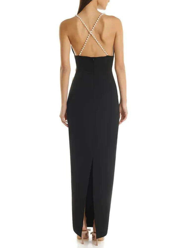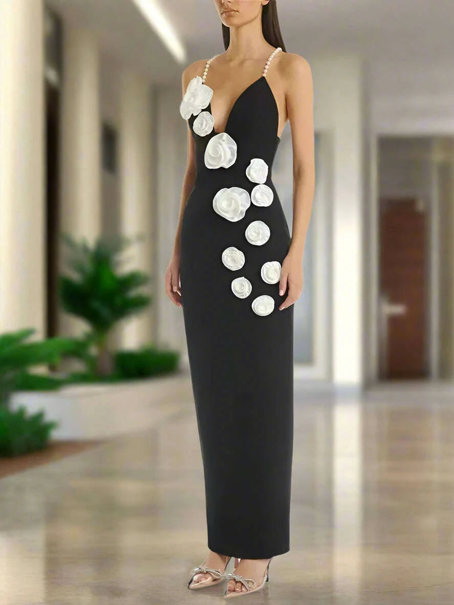 Elegant Contrast Pearl Slip Dress with 3D Floral Back Split for Women's Summer Evening Events - 2024 Collection