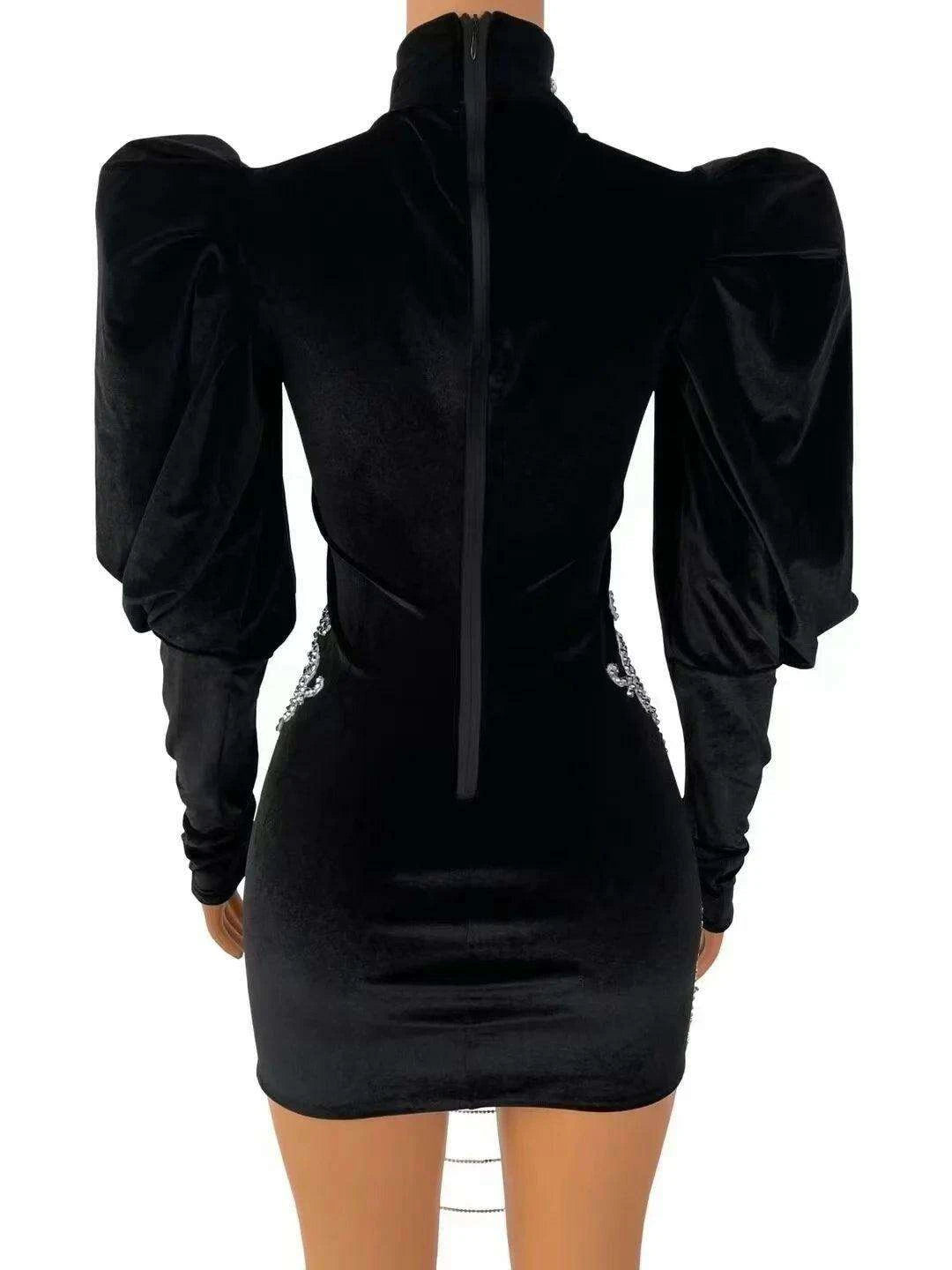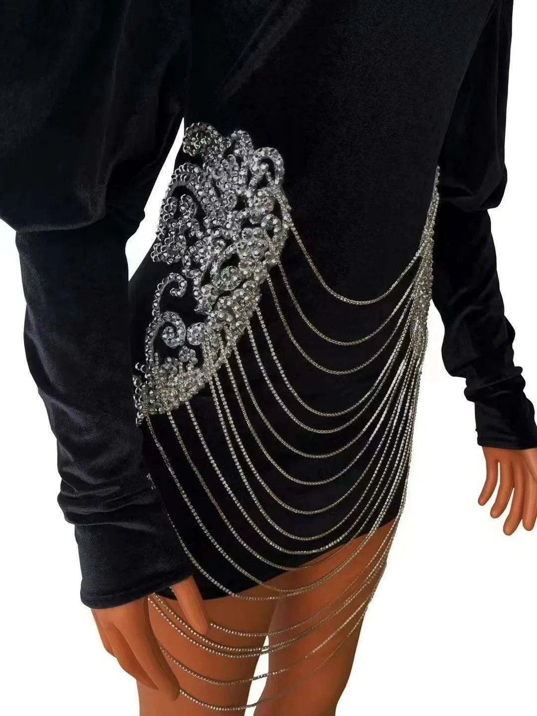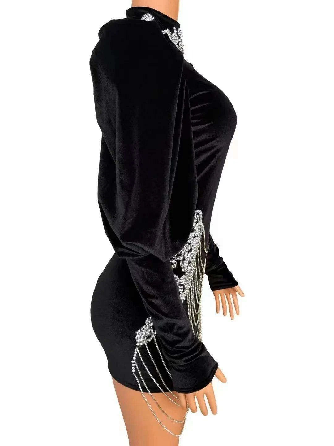Elegant Custom-Fit Black Velvet Dress with Dazzling Silver Rhinestones