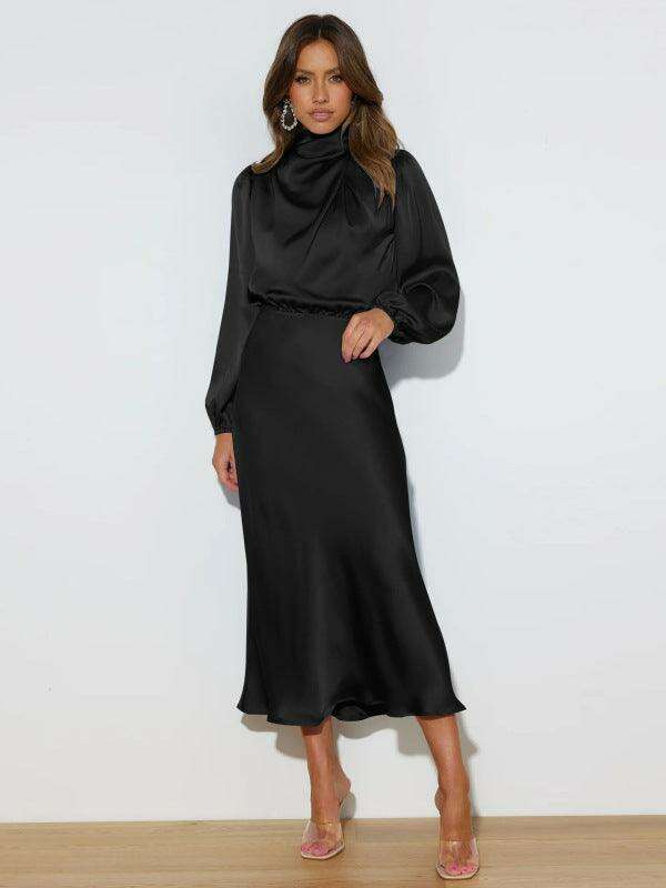 This sophisticated satin dress is not just a clothing item; it's a statement piece that embodies classic style with a contemporary twist. It serves as a versatile wardrobe essential for women who value elegance and comfort in their attire.