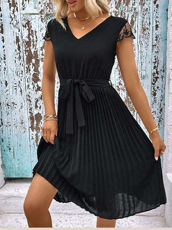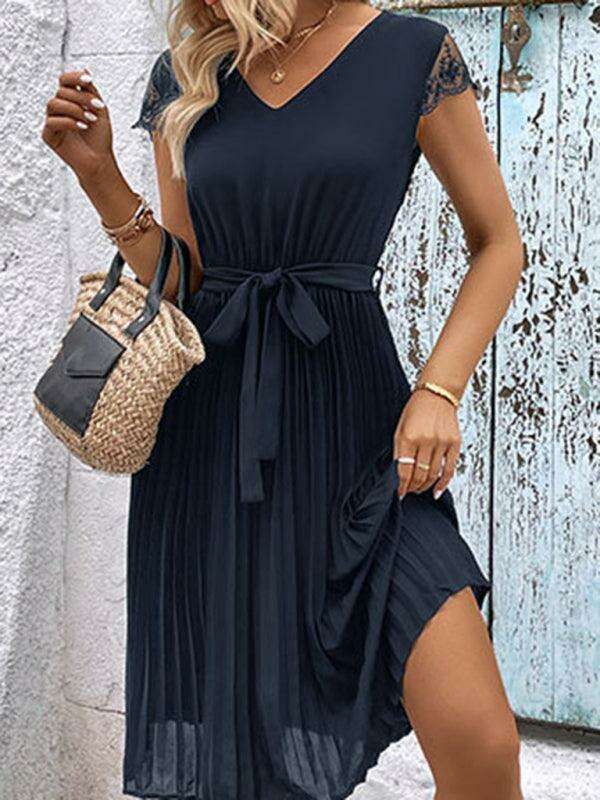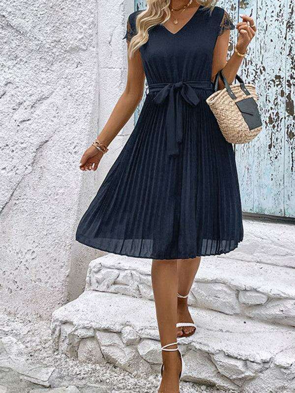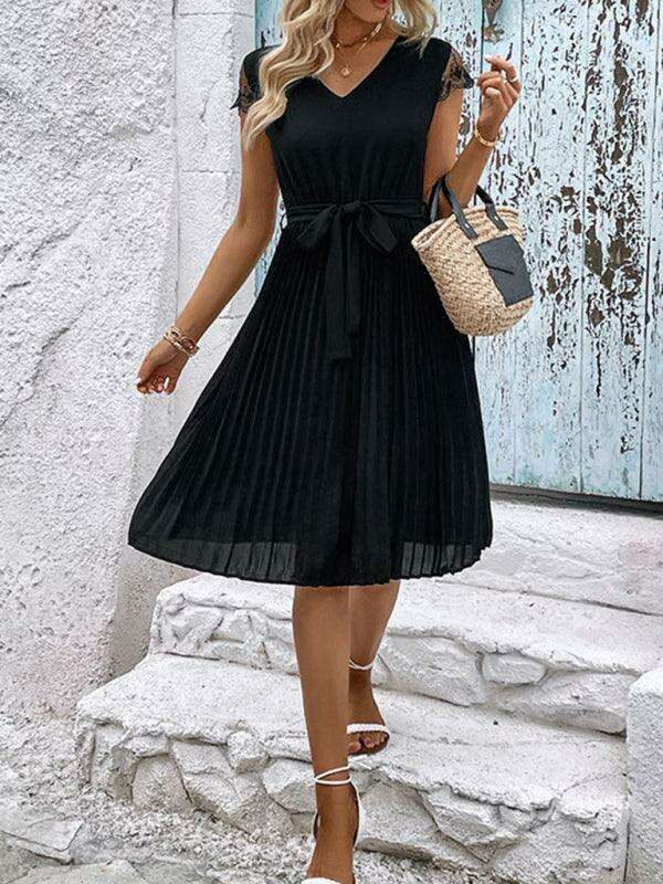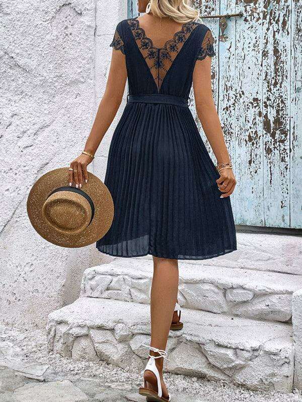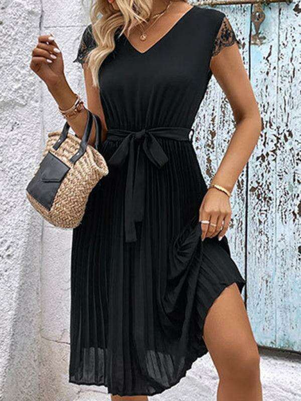 Chic Lace-Trimmed Pleated Dress for Elegant Women