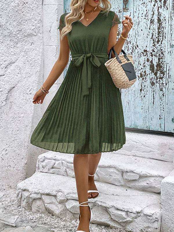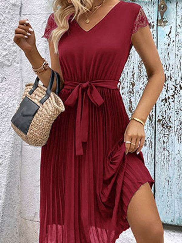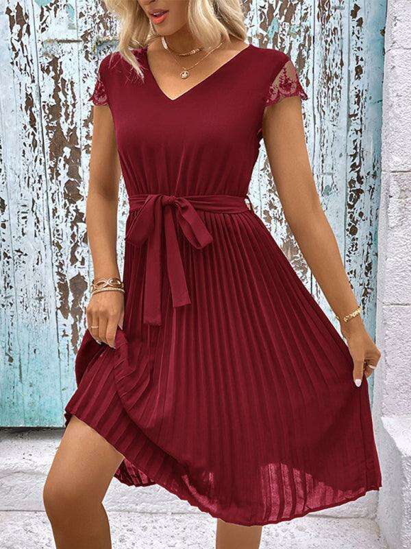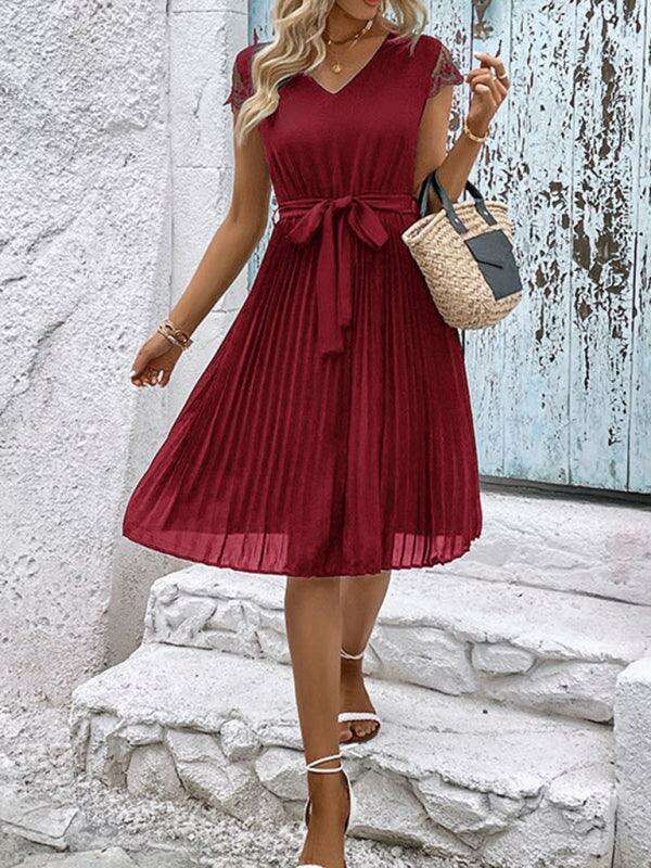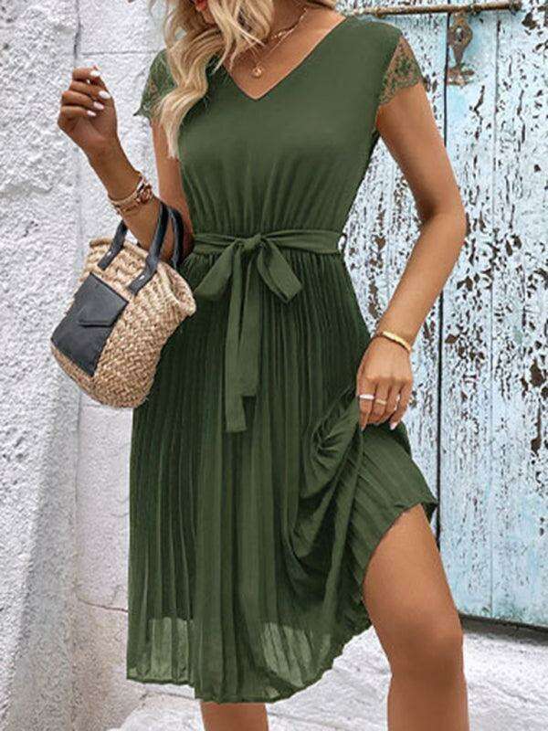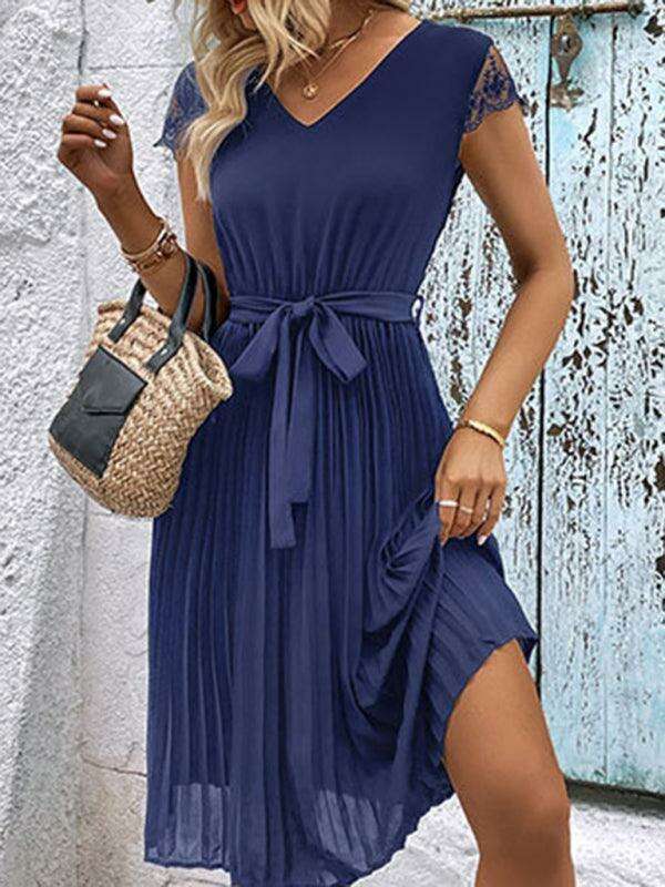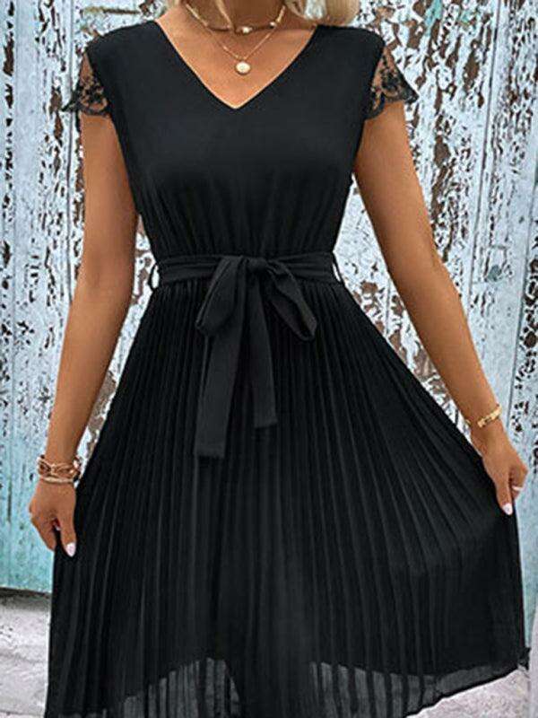 Chic Lace-Trimmed Pleated Dress for Elegant Women