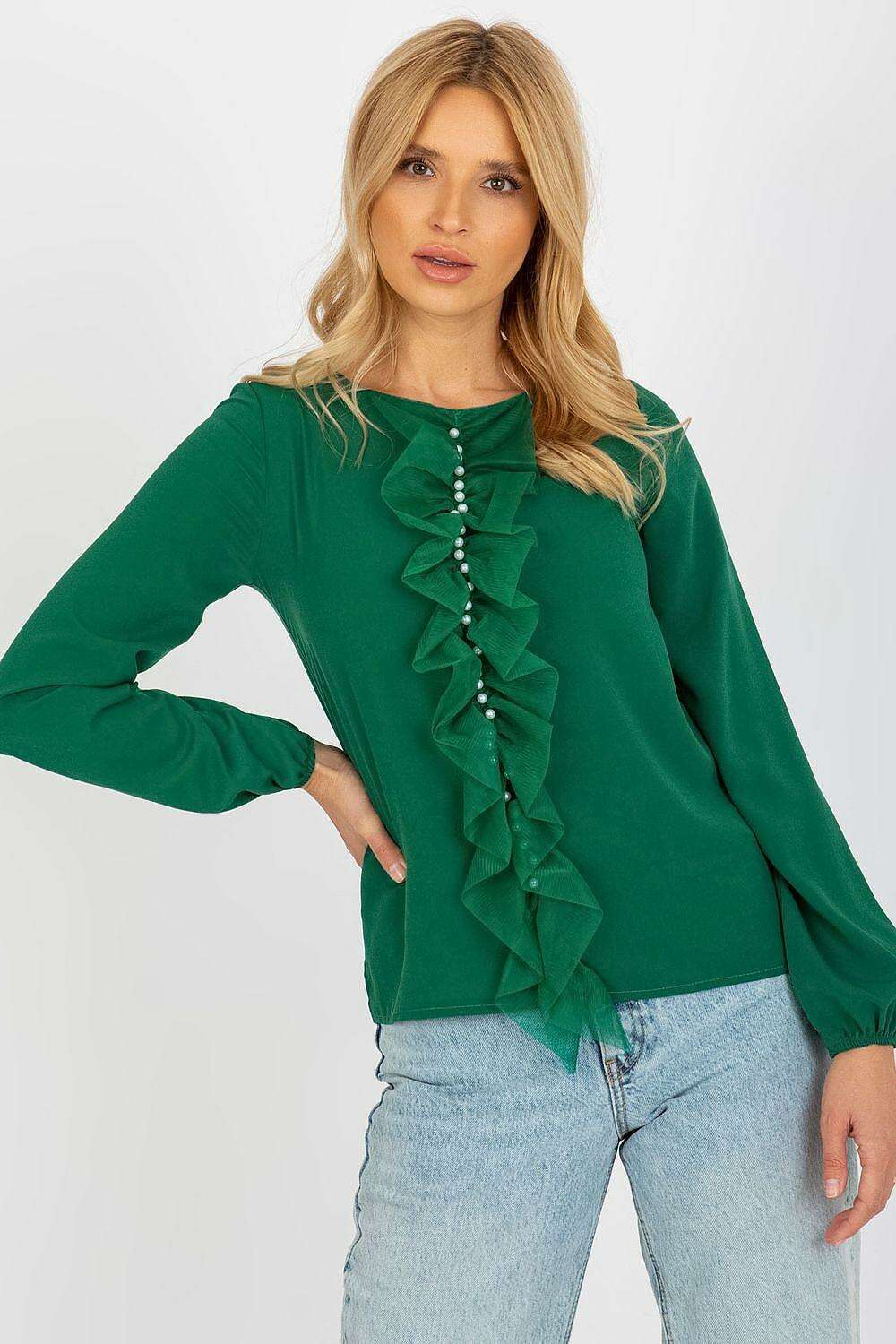 • Glamorous Details: Adorned with a decorative mesh frill embellished with pearls on the front, this blouse adds a touch of glamour to any outfit.