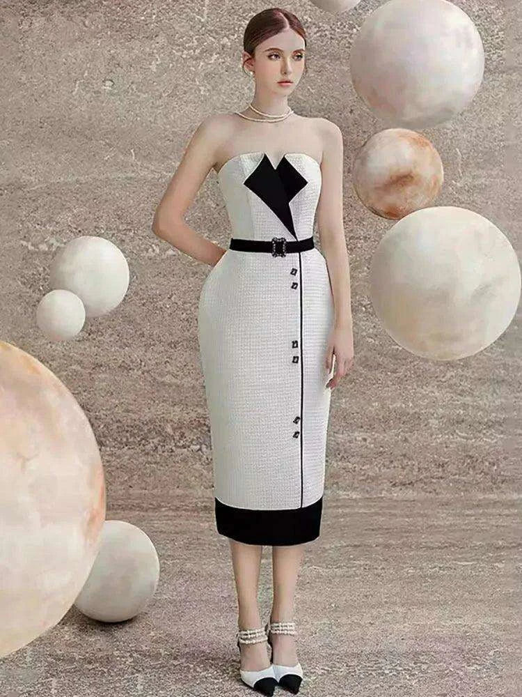 Chic Strapless Jacquard Weave Party Dress with Contrast Color Patchwork