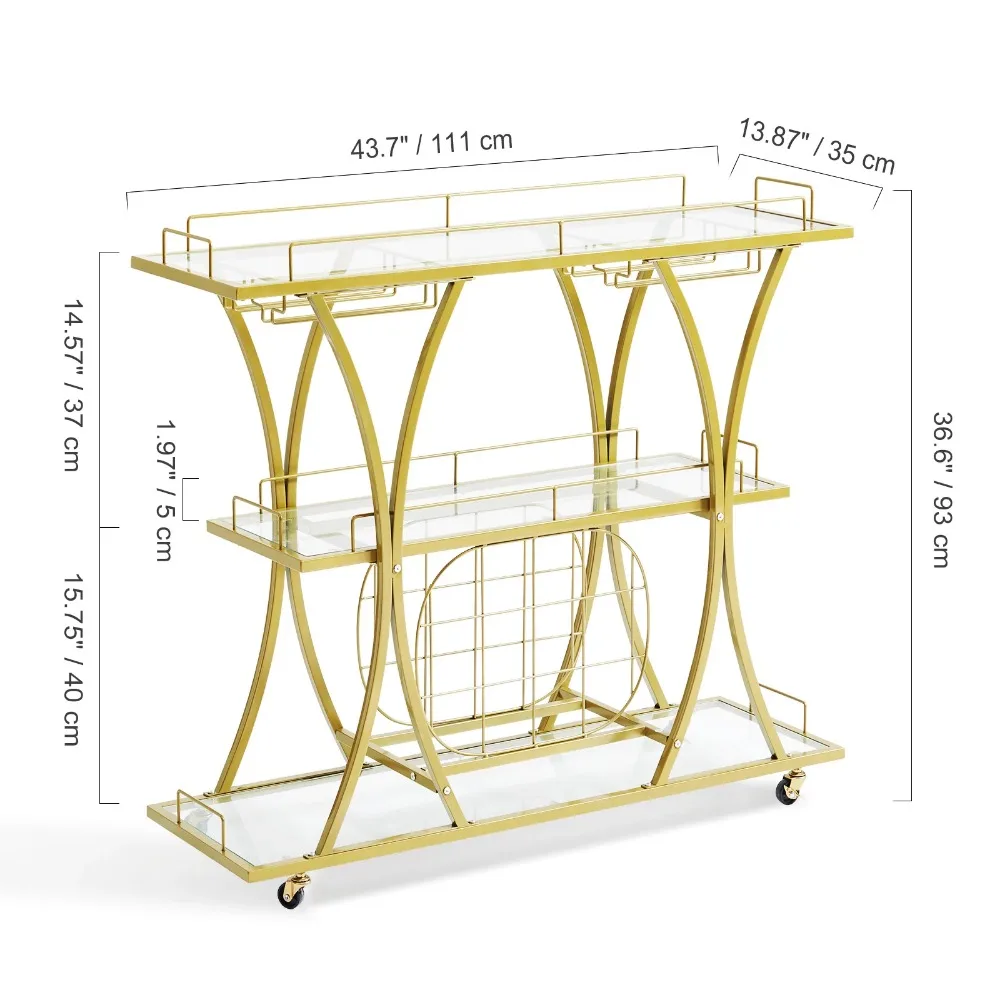 Élevez votre jeu d’hébergement avec notre élégant chariot de service industriel vintage. Mesurant 43,7 x 13,8 x 36,4 pouces, ce chariot à lingots dorés est un ajout polyvalent à n'importe quel espace, offrant suffisamment d'espace pour vos vins et verres préférés. Fabriqué à partir de verre trempé durable et d'un cadre doré robuste, il peut supporter sans effort jusqu'à 180 lb, ce qui le rend parfait pour les fêtes en plein air, la décoration intérieure ou comme chariot de service de restaurant. Que les festivités commencent !