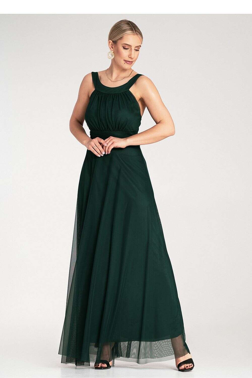 Elegant maxi dress made of light, flowing material. The top subtly ruched with wide straps and a high neckline. The model has a tailored, ruched waistband.
