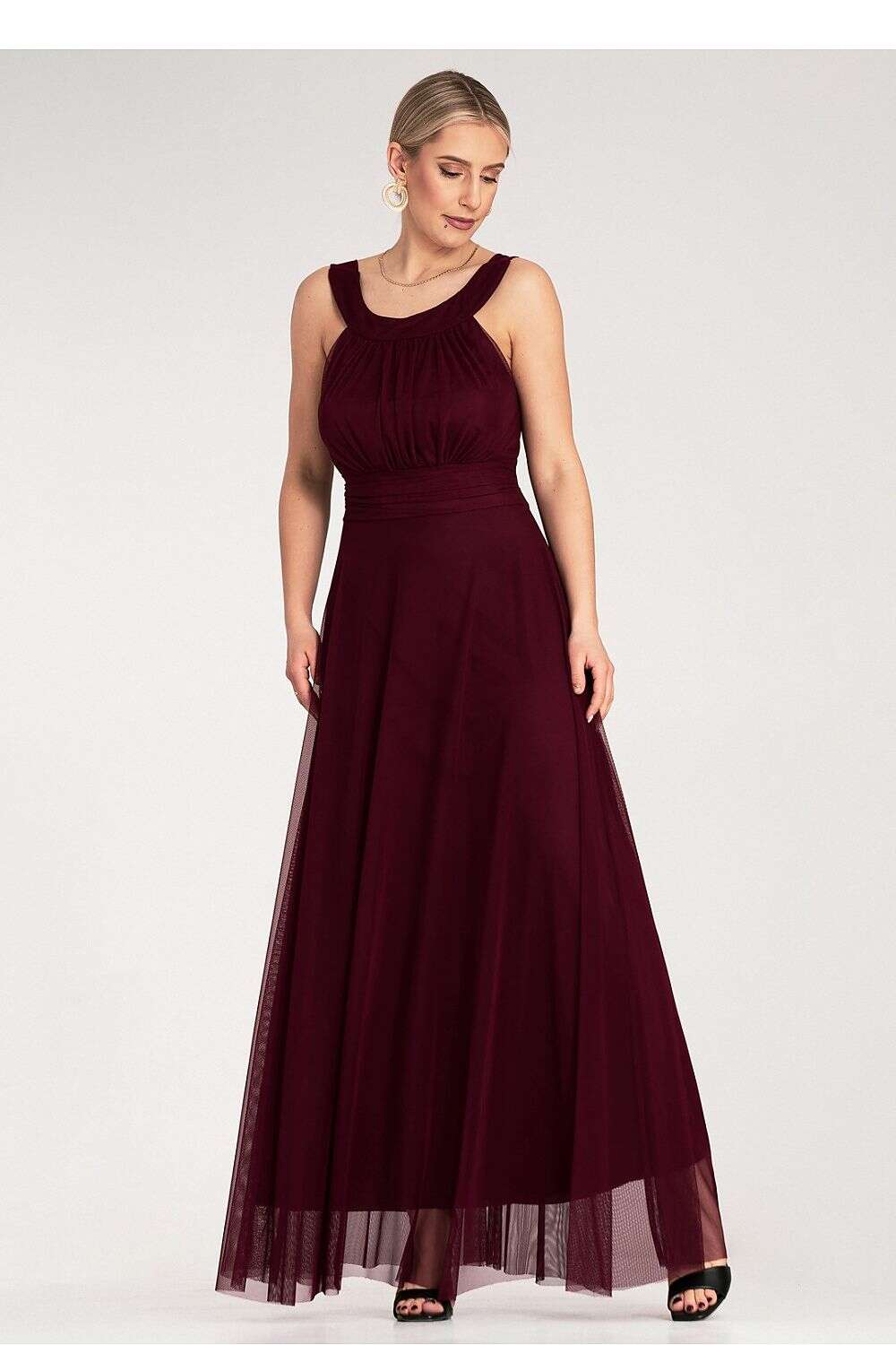 Elegant maxi dress made of lightweight, flowing material. The top is subtly ruched with wide straps and a high neckline. The model has a tailored, ruched waistband.