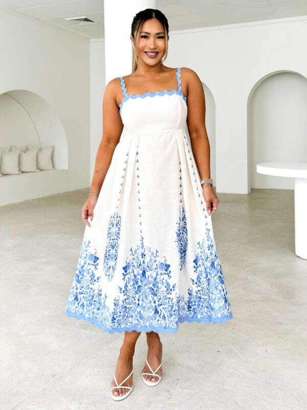 Fashion Print Wave Hem Sleeveless Backless Lace-up Suspender Dress