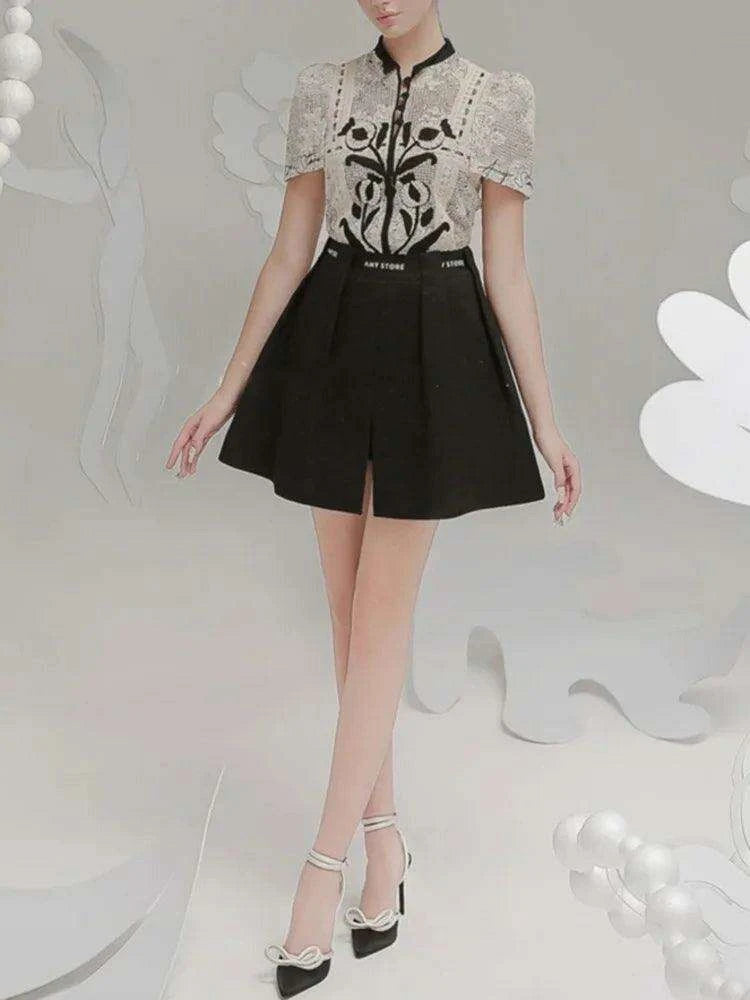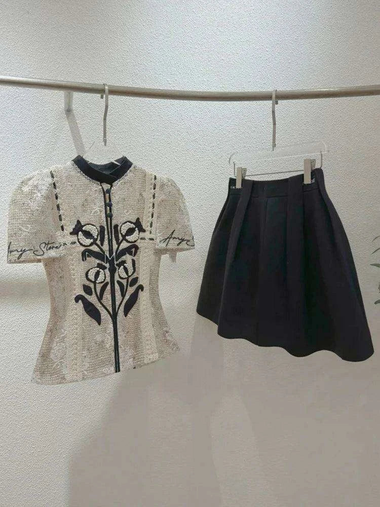 Floral Embroidery Lace Top and Pleated Skirt Set
