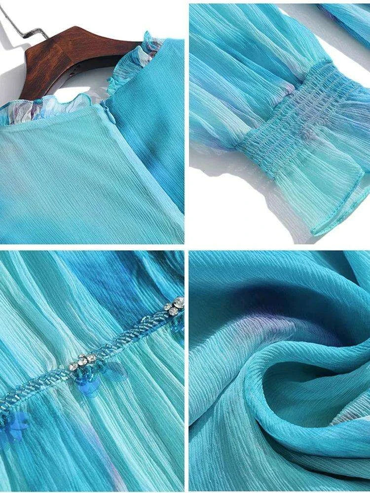 French Silk Flare Sleeve Dress with Floral A-line Skirt - Elegant Mulberry Silk Dress
