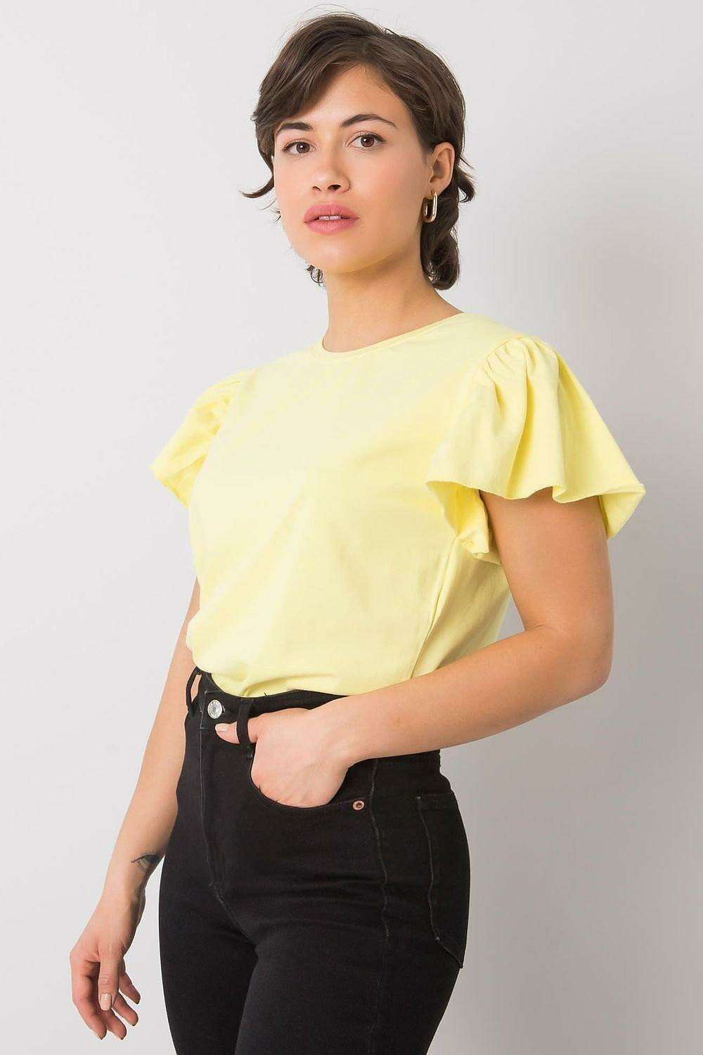 Frill-Trimmed Short Sleeve Cotton Top with Round Neck