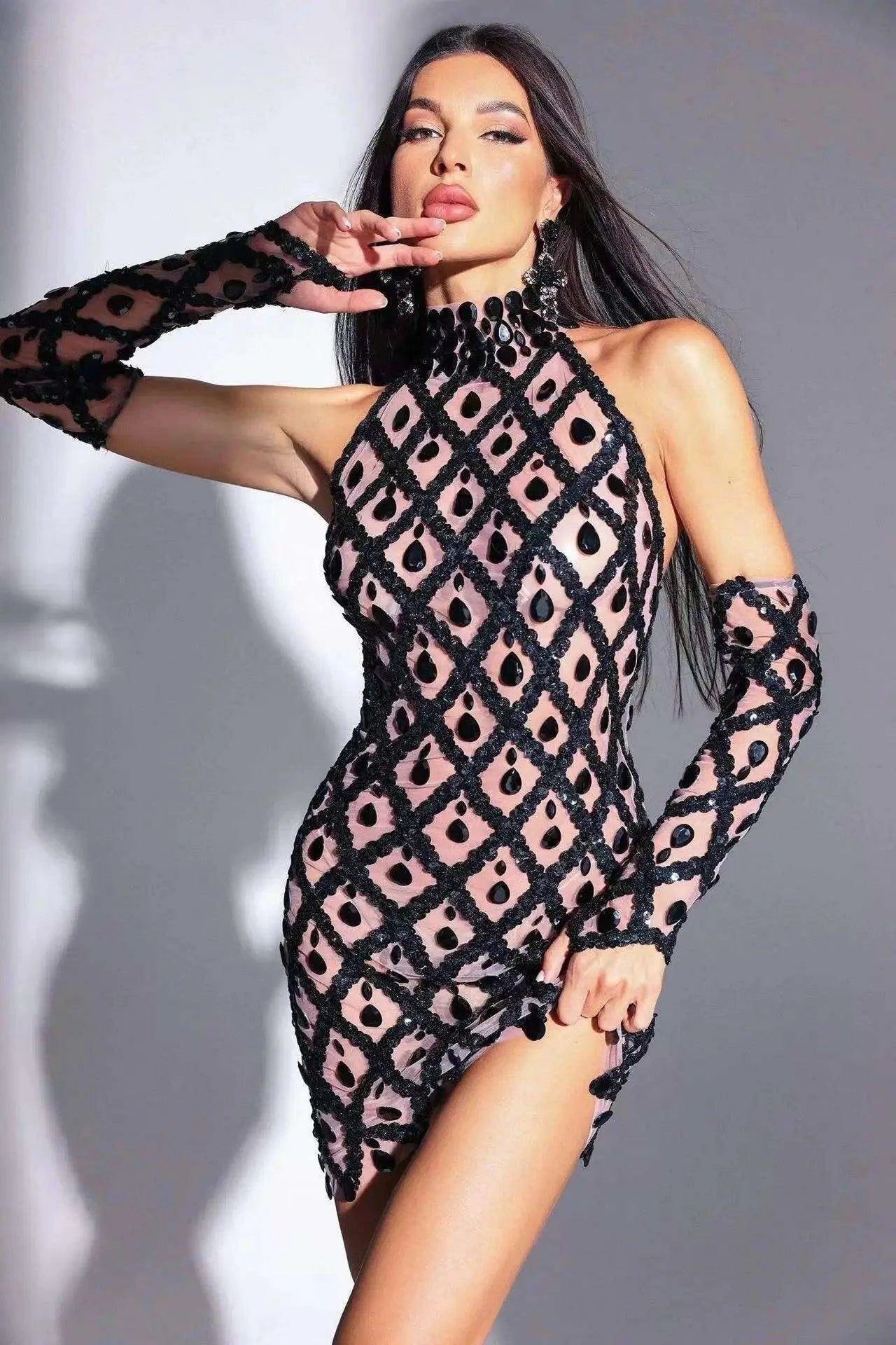 Step into the spotlight and elevate your nighttime glamour with our exquisite Glamorous Black Rhinestone-Embellished Halter Bodycon Mini Dress. This stunning piece is meticulously crafted to ensure you captivate attention at any event, striking the perfect balance between sophistication and playful allure.