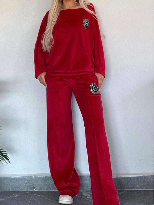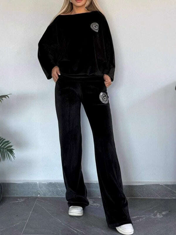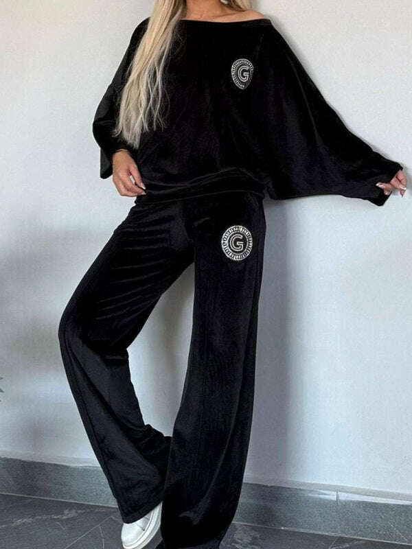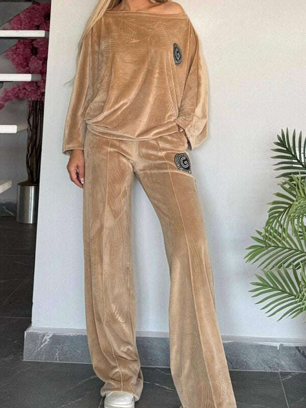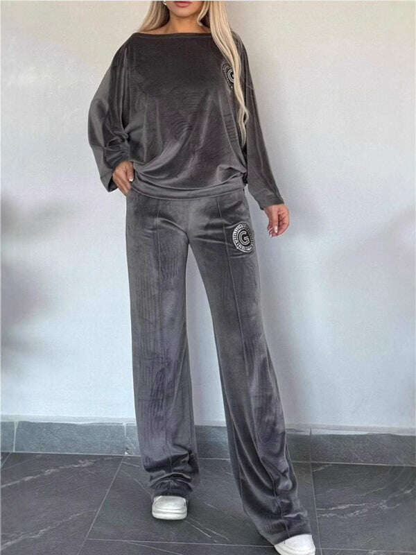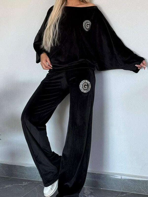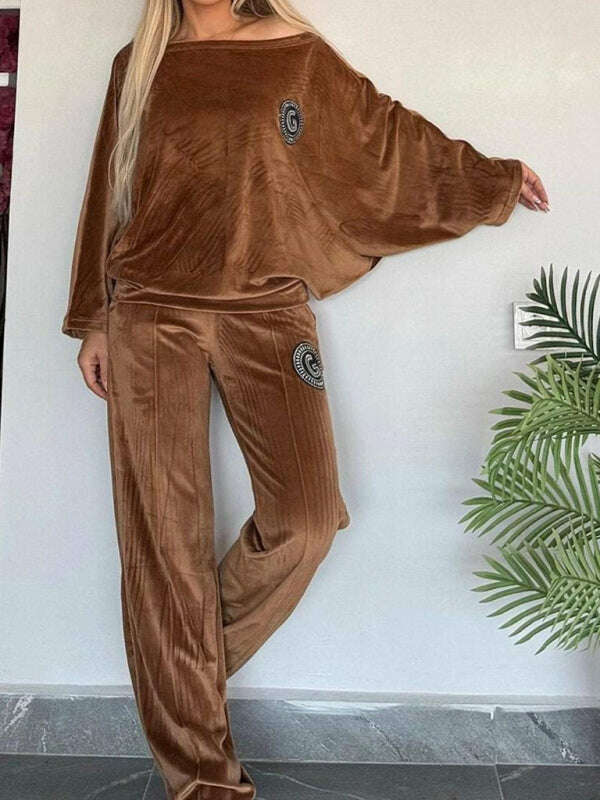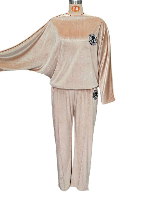 Gold velvet solid color round neck bat sleeves casual two-piece set