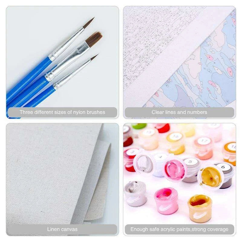 • Comprehensive Kit: Each set includes a premium linen canvas, 3 high-quality brushes, and vibrant acrylic paints, ensuring you have everything required to get started on your artistic journey.