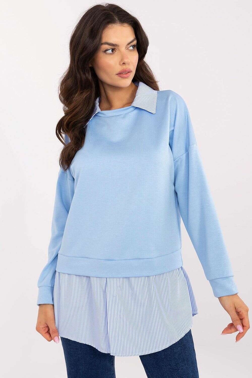 Casual women's blouse perfect for everyday wear and work. Made from a high-quality blend of viscose, cotton and elastane, it is soft, breathable and comfortable to wear. The smooth material gives it an elegant simplicity, while the contrasting striped insert at the bottom adds an original accent.