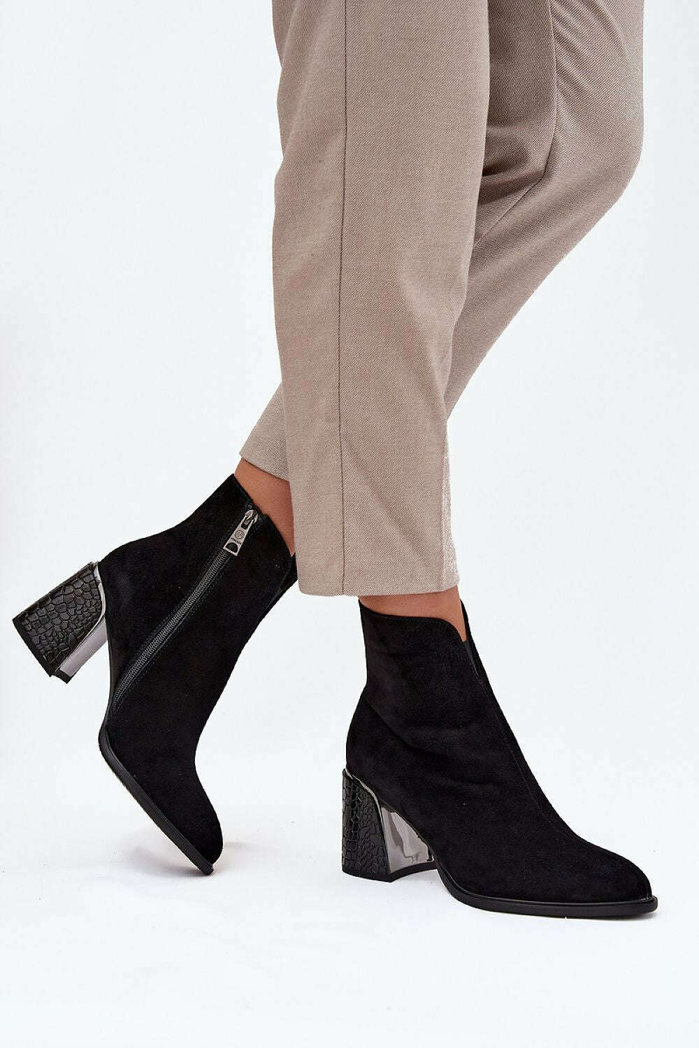 Women's ankle boots from Vinceza made of natural suede are a combination of elegance and modern style. Set on a column type heel, which stands out with subtle embossing and a mirrored element. Almond-shaped toes emphasize the feminine look, and the zipper makes it easy to put on quickly. The insulated interior provides comfort and warmth on colder days, making them an ideal choice for autumn and winter.