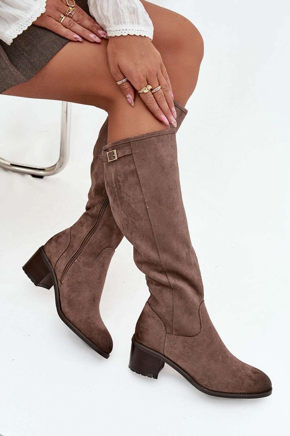 Vinceza Women Eco Suede Heel Boots – Model 219142, an elegant autumn-winter boot from Vinceza. Crafted from premium eco suede, these knee-high boots combine sustainable materials with timeless design. They ride on a stable block heel for comfortable every-step confidence, while a full-length zipper makes on-and-off a breeze. A slim strap with a gold buckle crowns the shaft, adding a refined detail that elevates both everyday outfits and dressier looks.