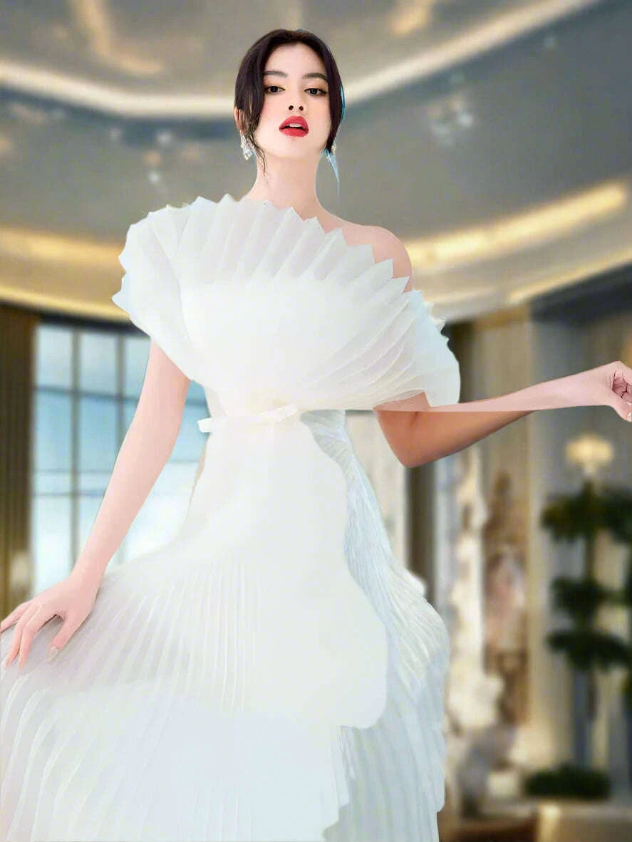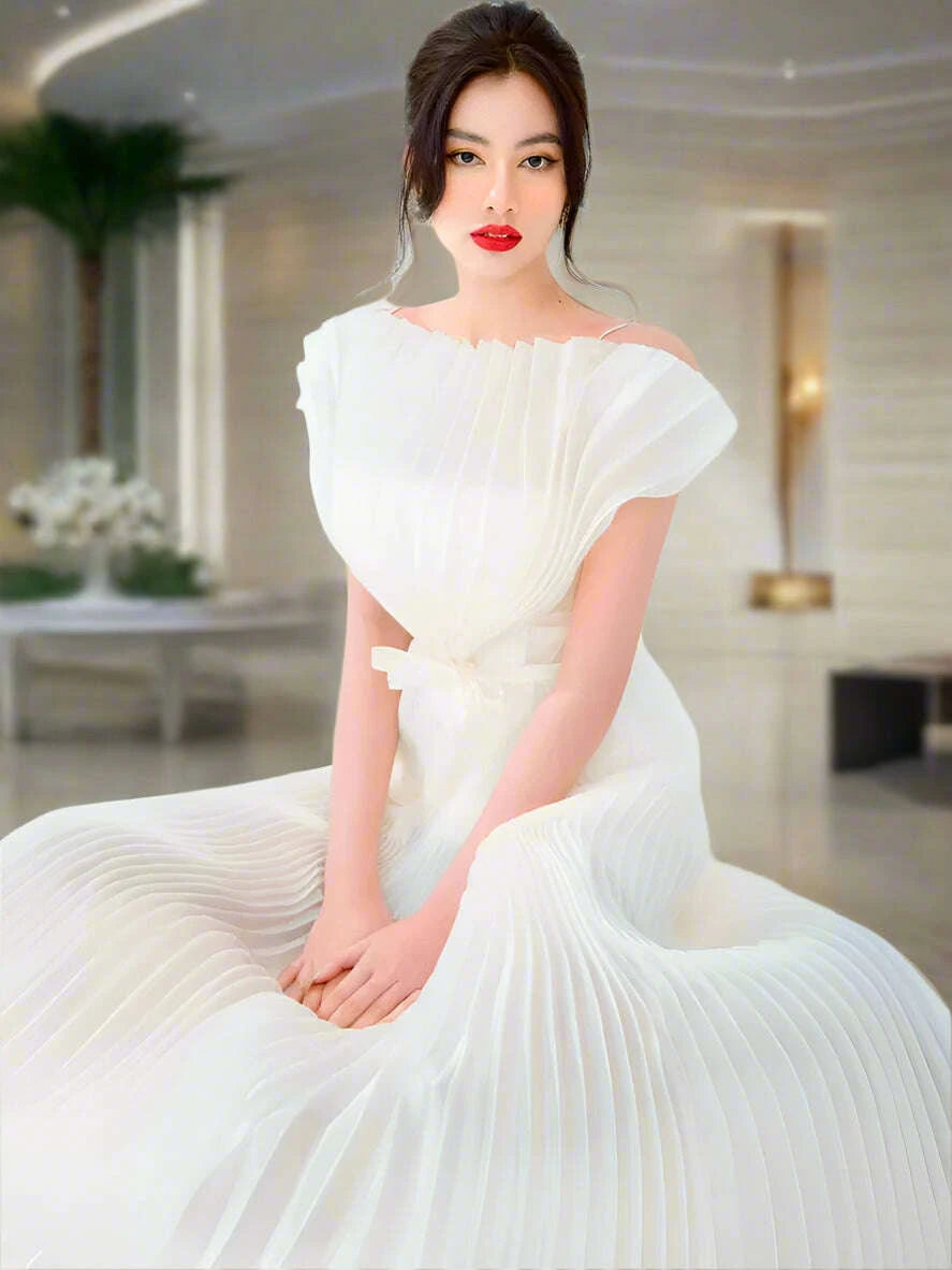 Step into summer in style with the Chic High Waist Summer Dress with 3D Pleats and Bow Accent - Sleeveless Slash Neck Design for Women.This stunning dress is designed for the modern woman who desires a perfect blend of elegance and comfort. Whether you’re attending a garden party or enjoying a casual day out, this dress is sure to turn heads and make a lasting impression.