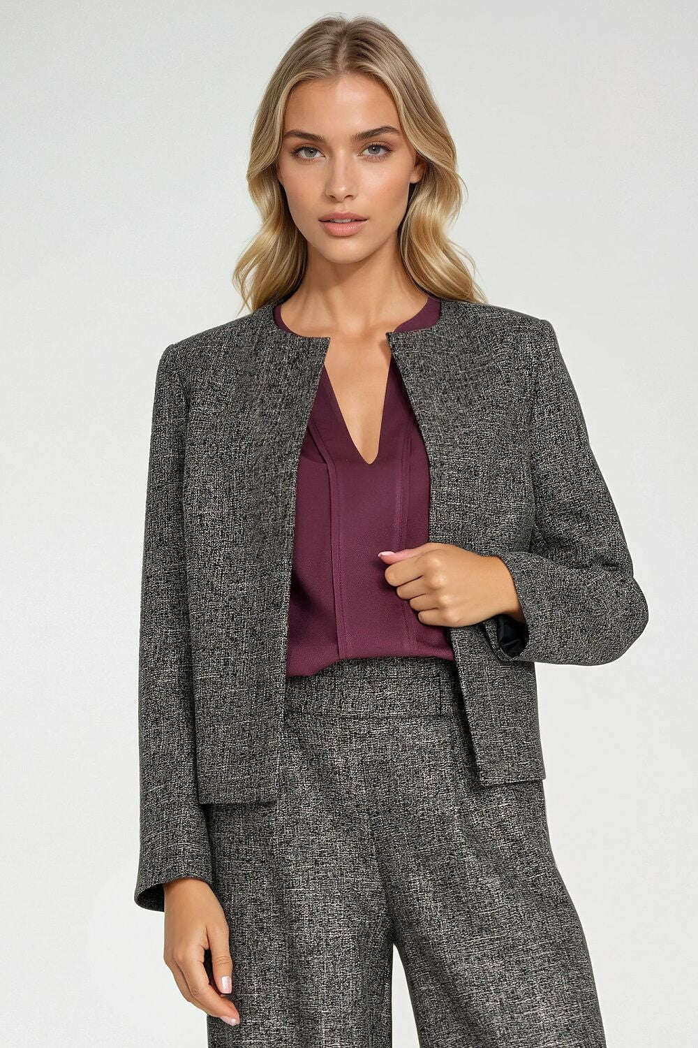 Stylish women's jacket with a regular cut in a short, boxy form is the perfect choice for fans of elegance with a touch of modernity. Made of fabric with a melange texture and uneven color, it looks exceptional and adds character to any styling. The model without fastening stands out with its minimalist design, and the shoulder pads delicately emphasize the silhouette, giving it a clearer line. For comfort and aesthetic finish, the jacket has a lining made of 100% polyester. It will work great in both elegant and casual outfits, adding a touch of subtle class and fashionable flair.