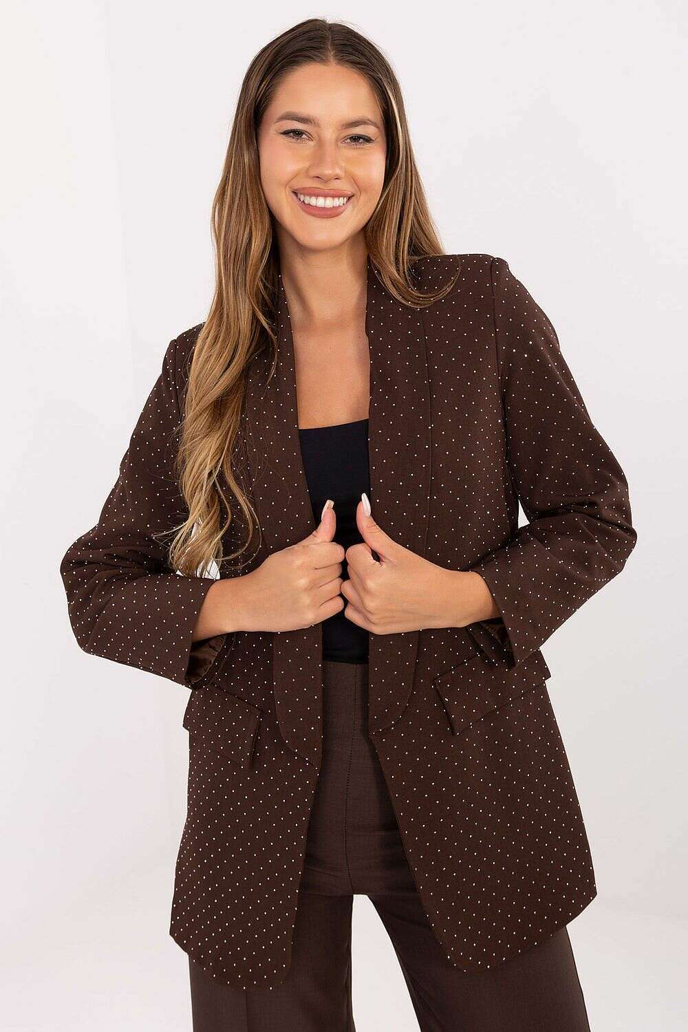 An elegant women's blazer without fastening is a unique piece of clothing, created for special occasions, perfect for parties, formal meetings, or evening outings. Made of a blend of polyester and viscose, with a lining ensuring comfort when wearing. The lapels give it a classic elegance. The whole blazer is covered with an application of shiny jet stones, which beautifully reflect the light, attracting attention and giving the outfit a unique character. The standard length and long sleeves make it a versatile choice, perfect for pairing with both pants and a skirt. This blazer combines elegance with a touch of glamour, perfect for women who appreciate style and a bit of sparkle in their outfits.