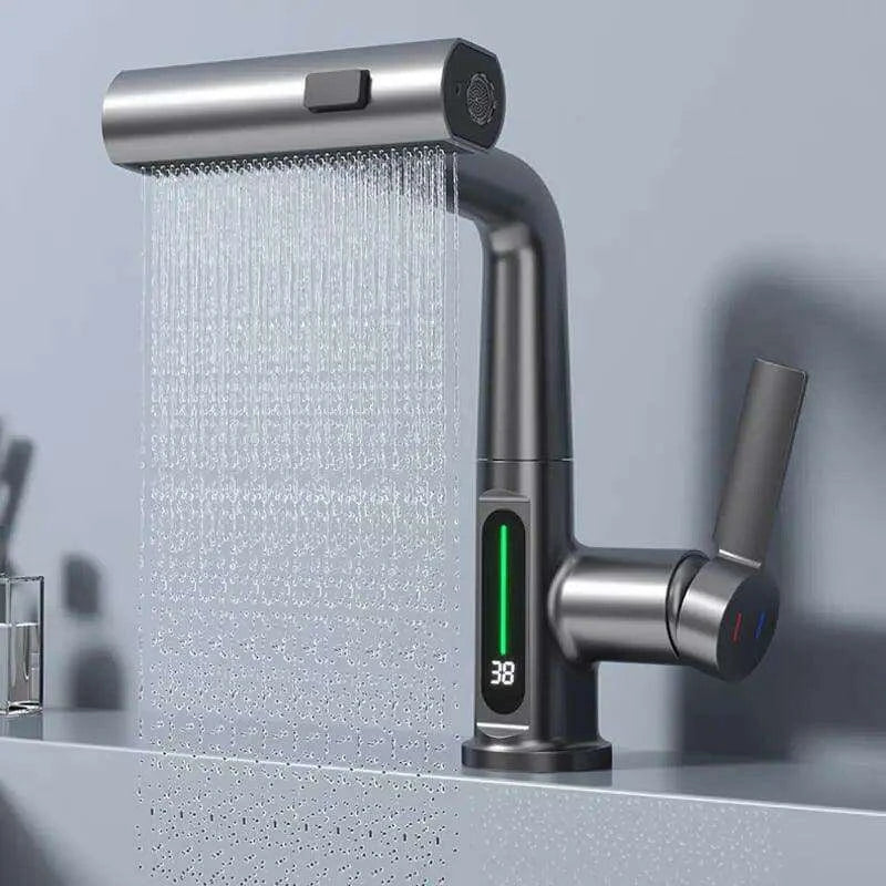 Upgrade your bathroom with our Modern LED Temperature Display Waterfall Basin Faucet with Pull-Out Sprayer.