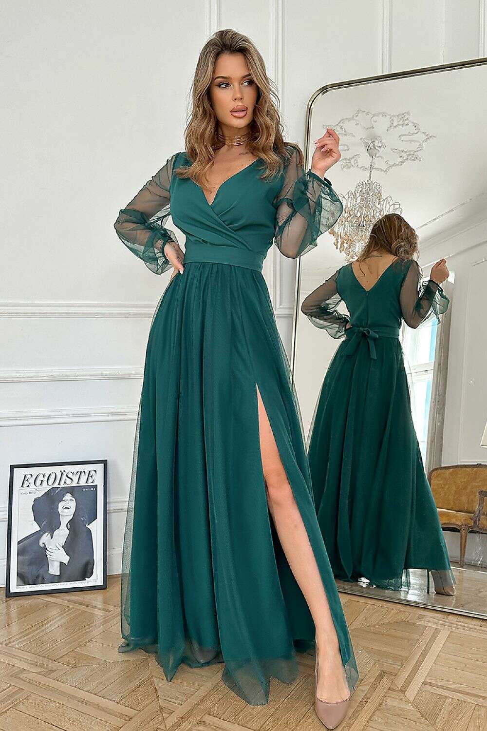 Elegant Long Dress With Belt Slit Hem Flowing Fabric offers timeless elegance with a modern twist. This beautiful long gown is crafted from flowing fabrics that drape gracefully, delivering a polished, salon-worthy silhouette for any formal occasion. The top features a delicate neckline that flatters and softens, while the bottom is two-layered with a leg slit that adds subtle charm as you move.