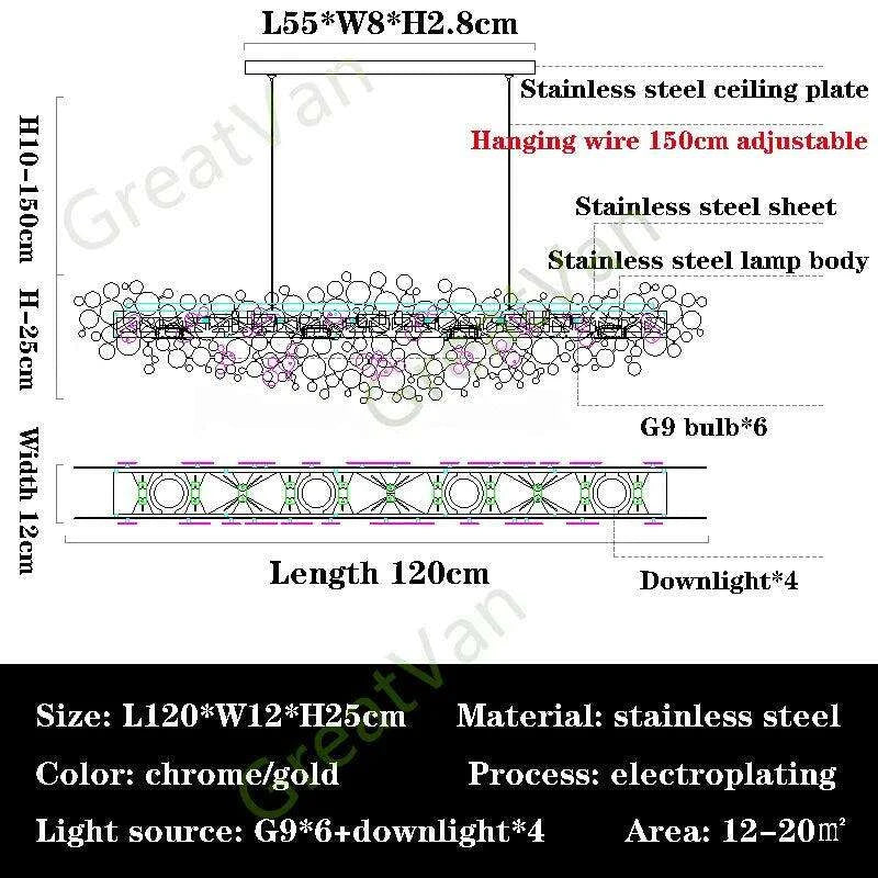 Ideal for dining rooms, living rooms, kitchen islands, and lobbies, this chandelier is more than just a light source; it’s a versatile piece that adds a touch of glamour to any space. Don't miss the opportunity to enhance the aesthetic appeal of your dining area. Embrace the perfect blend of style and functionality by ordering your Elegant Stainless Steel Chandelier today!