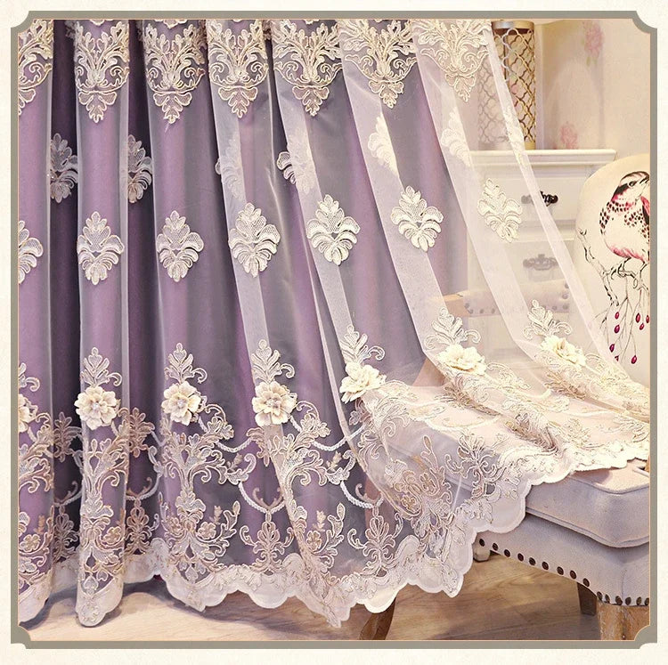 Luxury Embroidered Blackout Curtains Purple Tulle colorway sheer panel bedroom