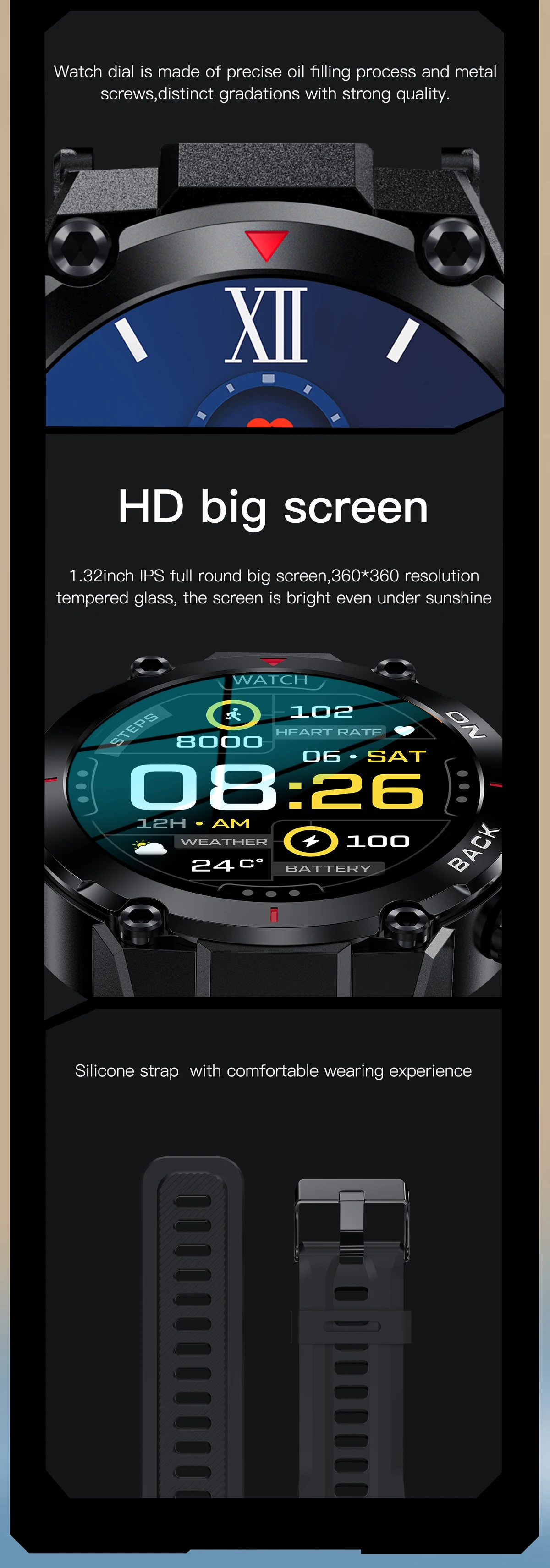 Grand écran rond IPS de 1,32 pouces, verre trempé de résolution 360 + 360, l'écran est lumineux même sous le soleil