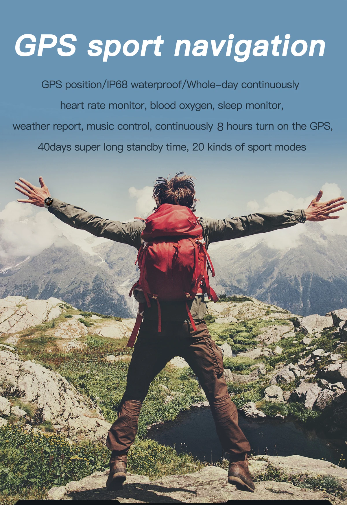 Position GPS/IP68 étanche/moniteur de fréquence cardiaque en continu toute la journée, oxygène dans le sang, moniteur de sommeil, bulletin météo, contrôle de la musique, 8 heures d'autonomie en continu sur le GPS, temps de veille super long de 40 jours, 20 types de modes sportifs