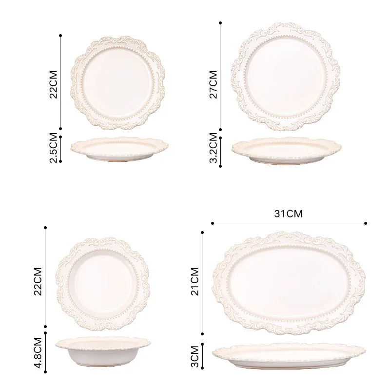 Améliorez l'esthétique de votre table à manger avec notre ensemble d'assiettes à dîner baroque français vintage en relief. Le design baroque complexe et l'artisanat nordique vintage se combinent pour créer une expérience culinaire vraiment unique. Fabriqués à partir de matériaux solides, ces plats sont non seulement beaux mais également durables, ce qui les rend parfaits pour un usage quotidien. Choisissez parmi différentes tailles pour répondre à vos besoins et élevez vos ustensiles de cuisine ménagers au niveau supérieur.