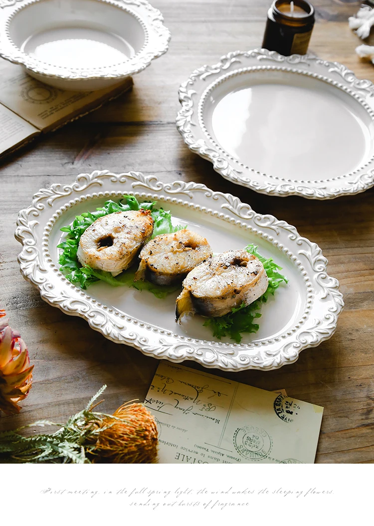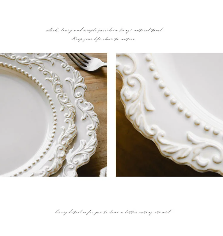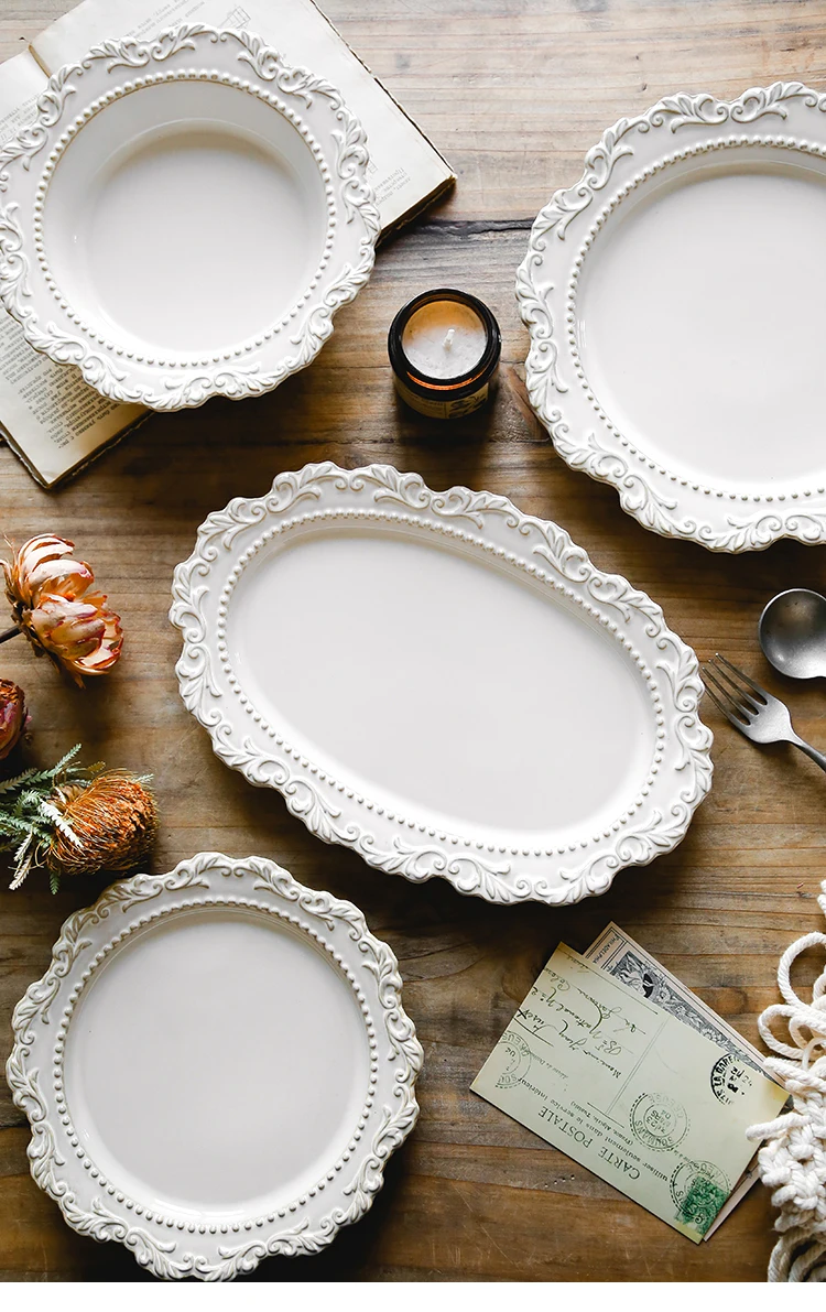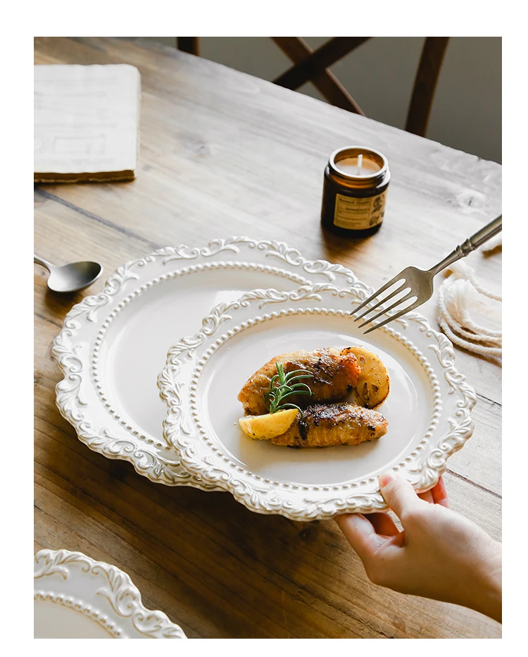Améliorez votre expérience culinaire avec notre exquis ensemble d'assiettes à dîner baroque français vintage en relief. Fabriqués dans le style nordique vintage, ces plats artisanaux sculptés de couleur unie ajouteront une touche d'élégance à votre collection d'ustensiles de cuisine. Idéal pour les ménages à la recherche d’ustensiles de cuisine au charme unique et intemporel.