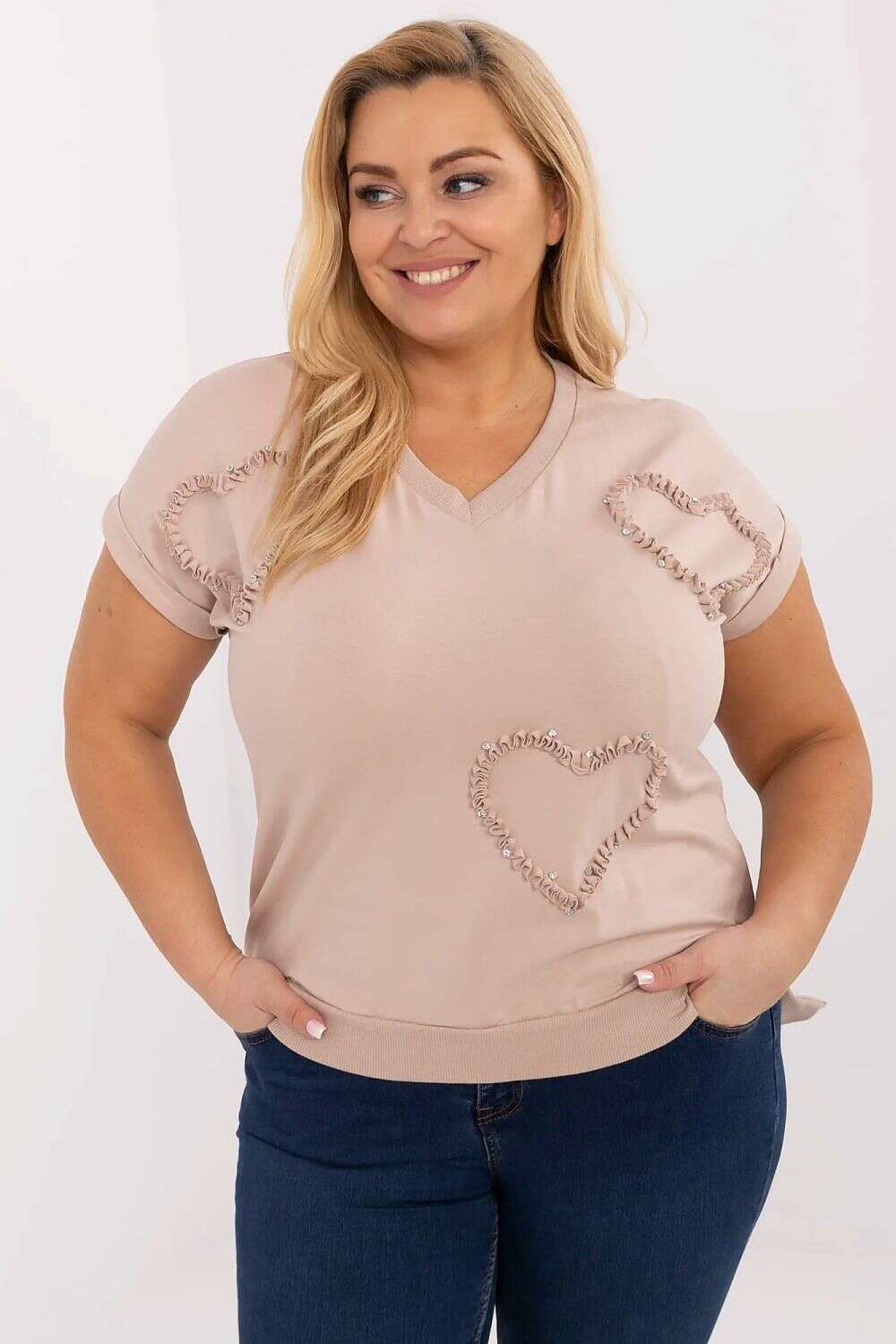 Women's plus size casual blouse is an ideal proposition for everyday wear as well as for work. Made of pleasant to the touch cotton with the addition of elastane, it provides comfort and perfect fit to the silhouette. The model is of standard length, with short sleeves and a feminine sweetheart neckline that subtly emphasizes the neck. The attention is drawn by a spectacular application on the front in the shape of hearts adorned with sparkling zircons, adding an elegant and delicate charm to the blouse. Great for everyday stylizations, it will work well with both jeans and more classic trousers or a skirt. Universal, comfortable, and with character, perfect for work and for more casual meetings.