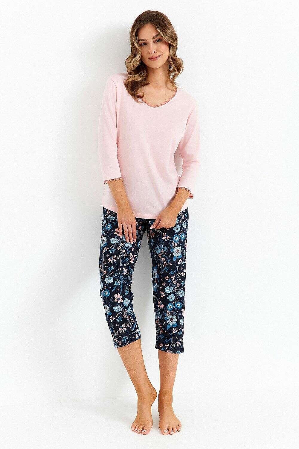 Women's and stylish pajamas that combine comfort with elegance. The top with a V-neckline is subtly finished with delicate lace, as are the 3/4 sleeves, giving the whole a romantic character. Loose fit and practical pockets increase wearing comfort. The set includes 3/4 pants with a trendy print. An elastic band at the waist ensures a comfortable fit. An ideal proposition for women who appreciate subtle details and comfortable relaxation.
