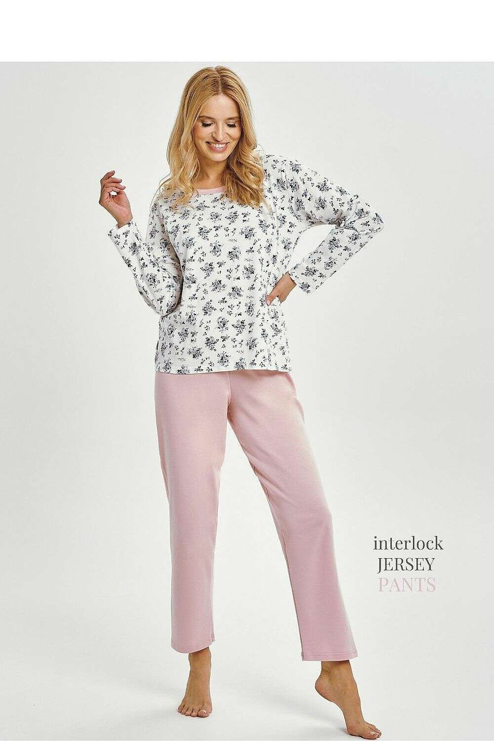 Comfortable and classic women's pajamas made of high quality interlock cotton. The material is exceptionally soft, gentle on the skin and at the same time breathable, perfect for a peaceful sleep at any time of year. The long-sleeved blouse with a simple cut provides comfort and freedom of movement. The set includes long pants without pockets, in a regular fit cut, finished with a wide elastic waistband for better fit and comfort. Pajamas packed in a plastic bag, also ideal as a practical gift.