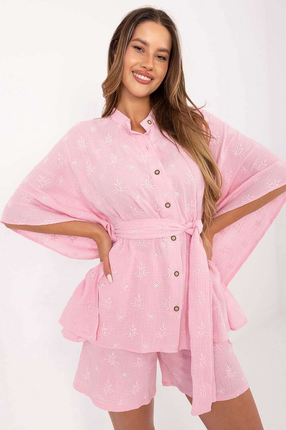 A set consisting of a shirt and shorts is an ideal proposal for everyday, comfortable stylizations. Made of natural, breathable muslin cotton with delicate embroidery on the material, which adds subtle elegance to the whole. The shirt, buttoned up, with a comfortable belt to tie at the waist, has 3/4 sleeves and a stylish stand-up collar at the neckline, giving it lightness and a modern character. The shorts, with a simple cut and high waist, are equipped with practical, side slip pockets, and have a comfortable elastic waistband, guaranteeing a perfect fit. The whole creates a coherent and comfortable set, perfect for summer days and everyday occasions.