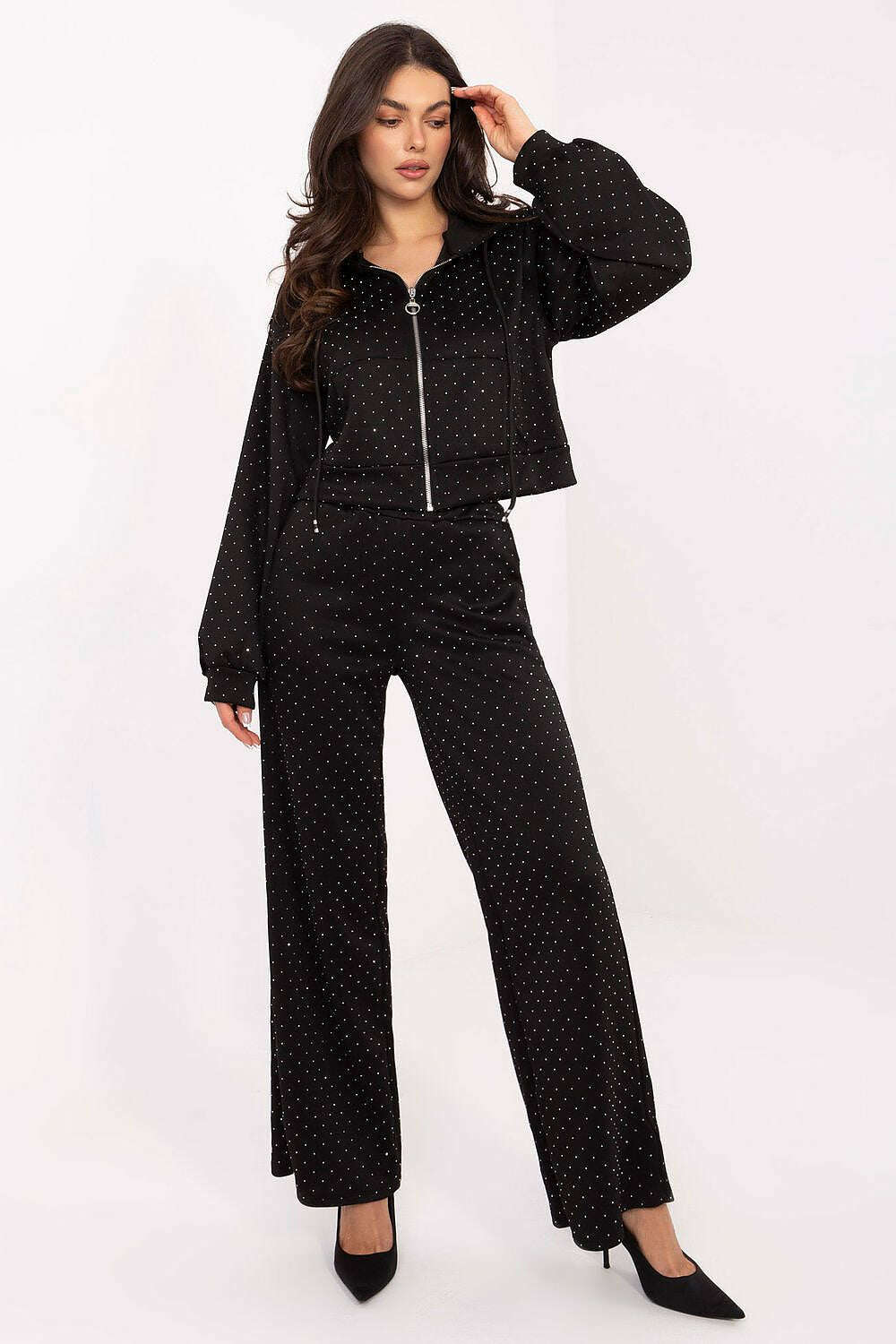 Crafted from a premium viscose-polyester blend (70% viscose, 30% polyester) with a varied texture, the fabric drapes beautifully for a flattering silhouette and all-day comfort. A spectacular jet application across the surface adds an elegant character and a subtle glow, setting this set apart from typical activewear.