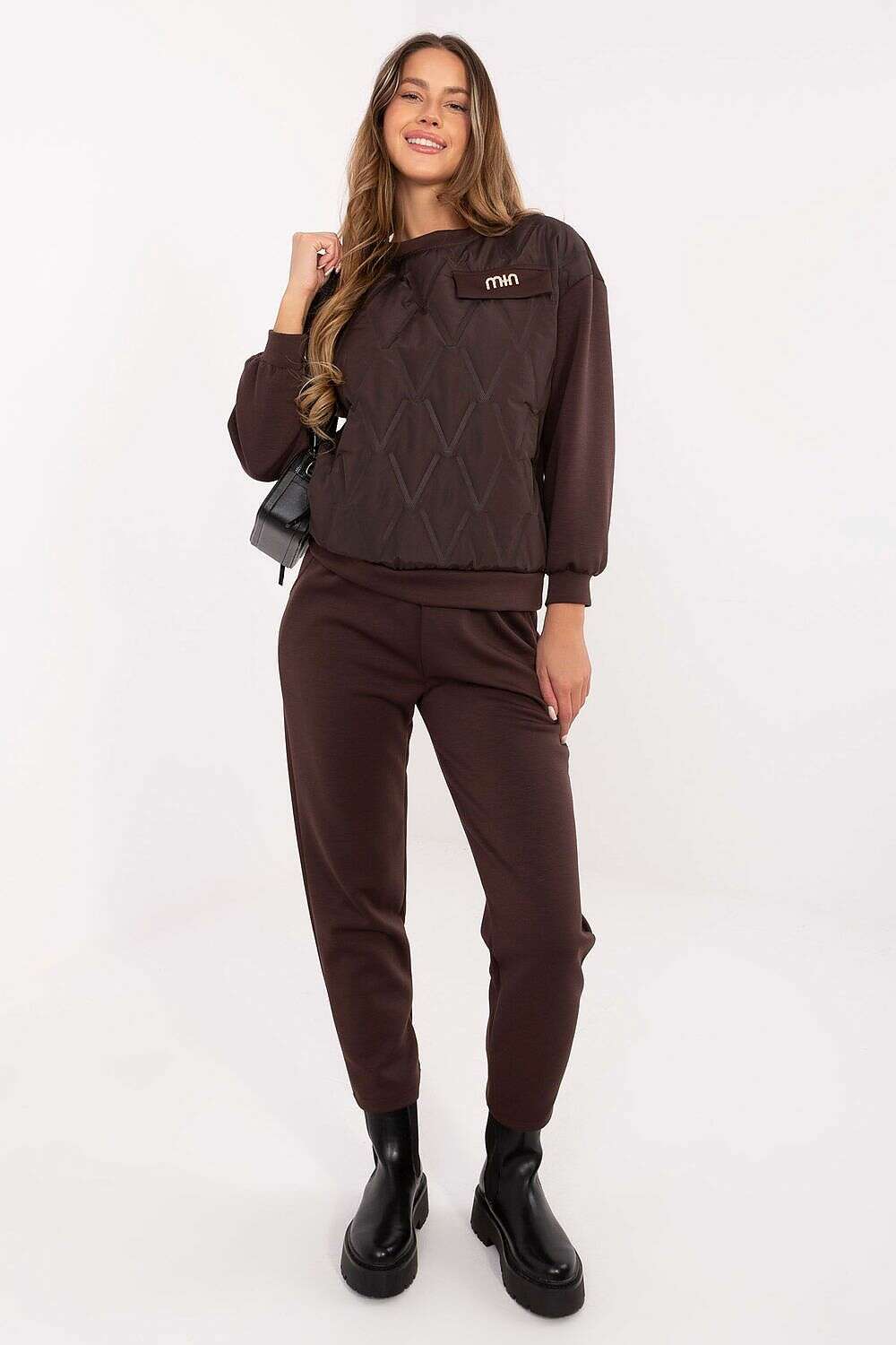 The set includes a blouse and tailored trousers that work in harmony for a cohesive, comfortable look. The blouse features a round neckline, long sleeves, and a quilted front adorned with a delicate brooch, adding a subtle touch of sophistication to your daily wear.