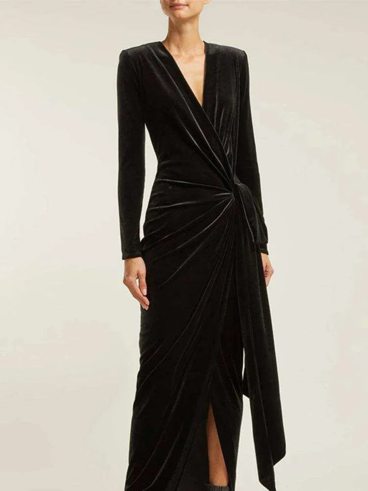 Introducing the Sophisticated Asymmetrical Velvet Evening Dress with Alluring Deep V-neck for Women -  Autumn Collection, a perfect blend of elegance and modern style. This exquisite gown is designed for the woman who wishes to make a stunning impression at any formal event. With its unique features, this dress is more than just a piece of clothing; it’s an expression of confidence and allure.