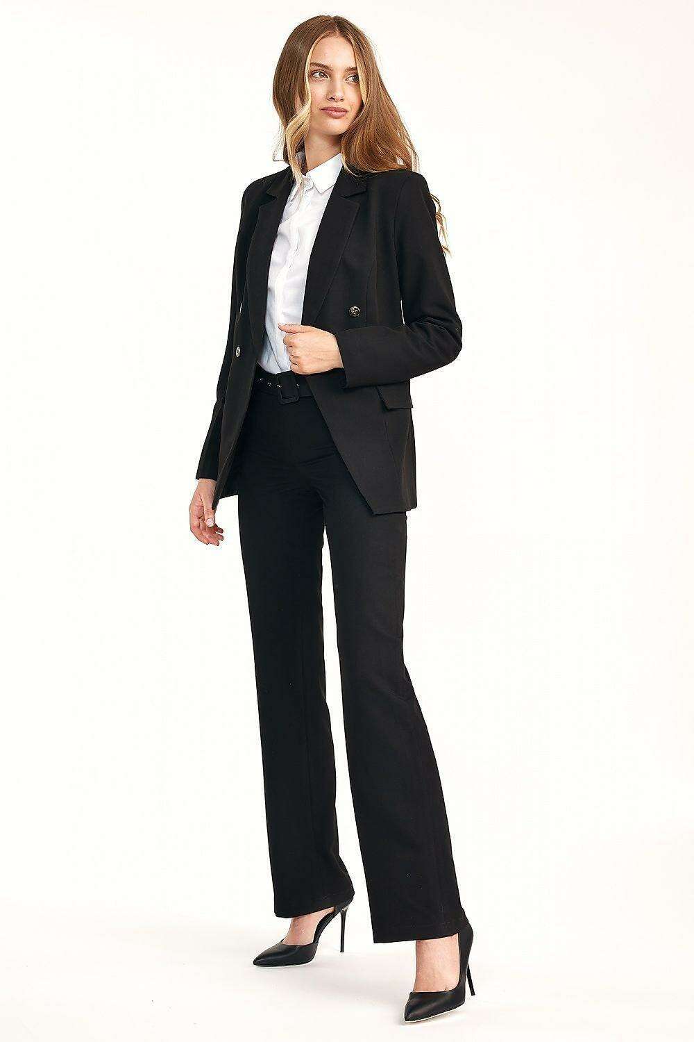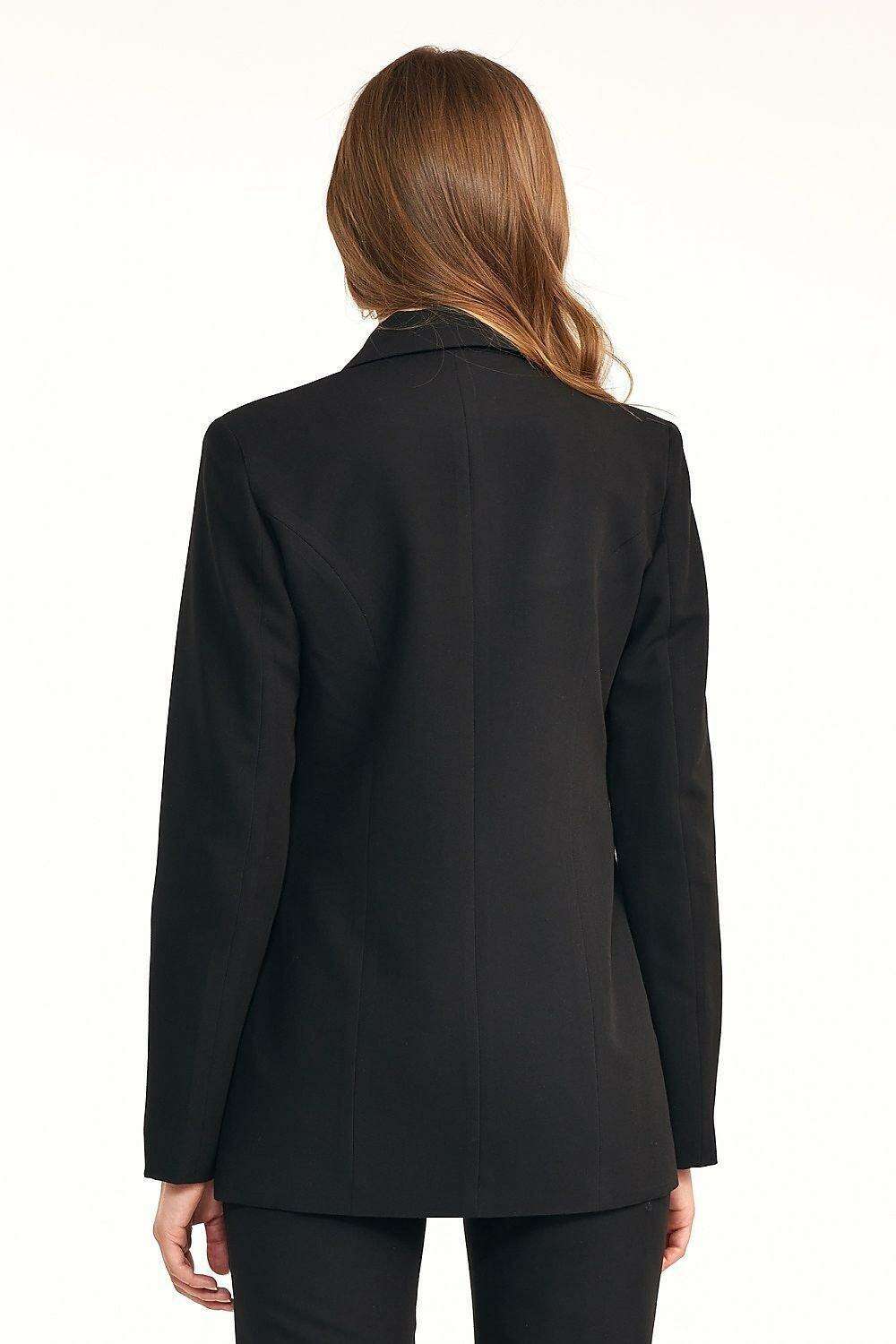 • Double-breasted silhouette delivers a structured, elegant profile.