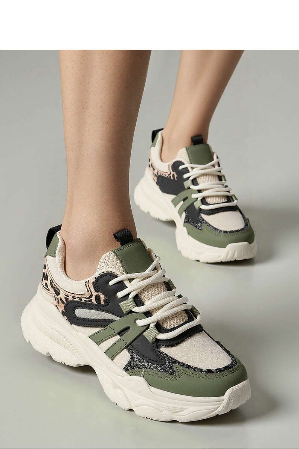 VEGA Black is a modern sneaker with a thick sole that combines sporty comfort with a fashionable design. The unique combination of green, black, and beige with leopard accents gives them a special character and makes them stand out from classic models. Material: Upper: Synthetic leather + textile material Interior: Textile material Sole: Synthetic material