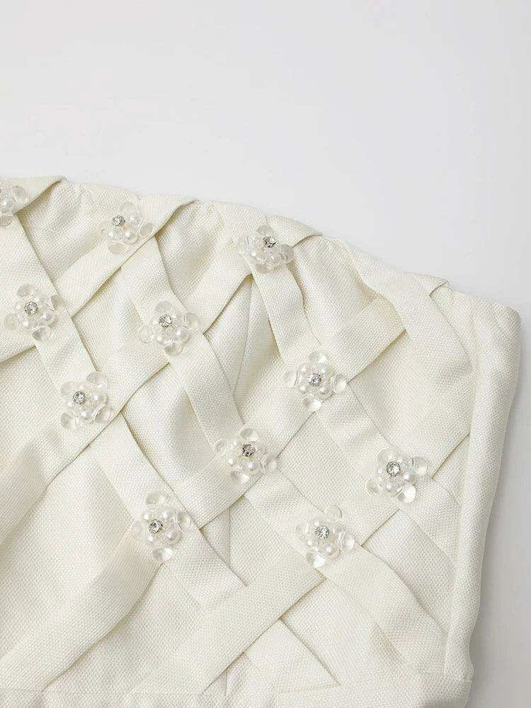 Striking Strapless High-Waisted Evening Gown with Unique Artistic Patchwork