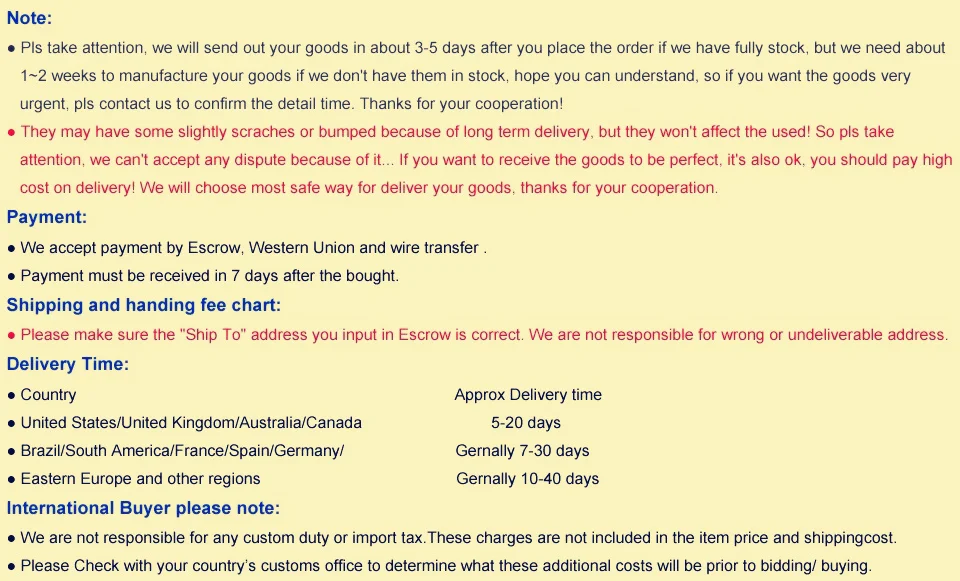 1. Généralement, nous organiserons l'expédition dans 2 à 10 jours ouvrables après réception du paiement sur Aliexpress. 2. Le produit sera envoyé par saperate pendant le transport, vous devrez assembler les articles par vous-même, si vous ne pouvez pas accepter, ne passez pas de commande. 3. Veuillez vous assurer que votre adresse de livraison et votre numéro de téléphone de contact sont corrects, nous ne sommes pas responsables de toute adresse non livrable. 4. Nous ne sommes pas en mesure de garantir le délai de livraison en raison des différents délais de dédouanement. Pour une commande urgente, veuillez nous contacter avant de passer commande. Il est suggéré de passer commande 4 semaines à l'avance pour assister au jour de votre événement. Si votre commande est urgente, ne passez pas de commande.