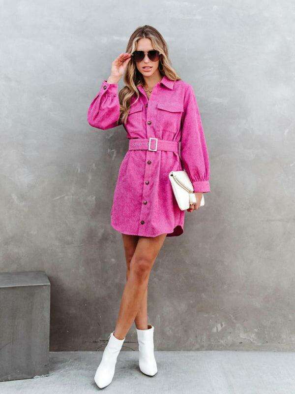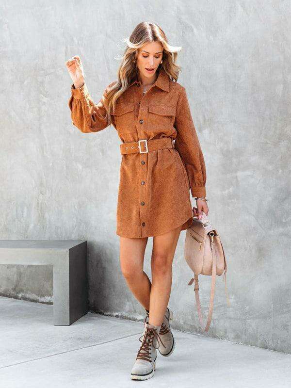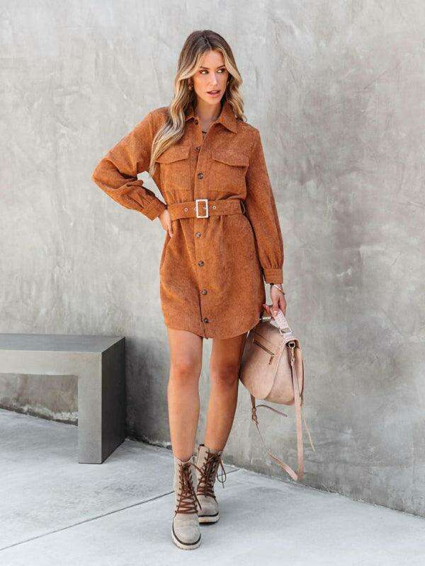 Stylish Corduroy Long-Sleeve Dress with Adjustable Waist Belt - Women's Casual Chic Fashion