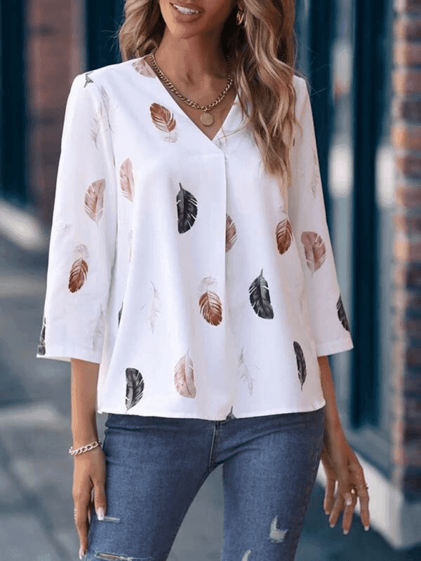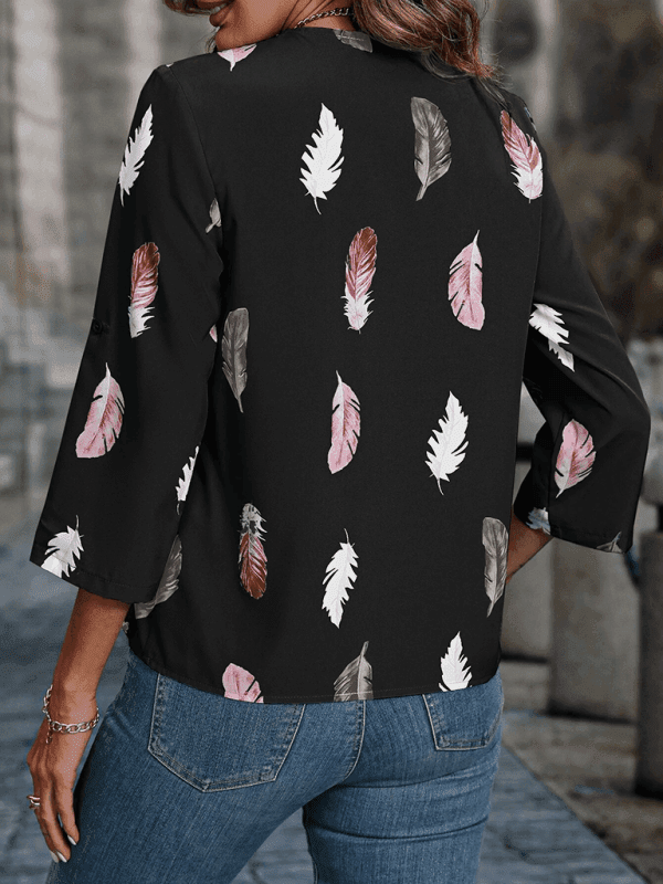 Elevate your casual wardrobe with our Chic Feather Print V-Neck Short Sleeve Blouse, a flawless combination of style and comfort. This blouse is designed to make you stand out, featuring a stunning feather print and trendy cropped sleeves, making it the perfect addition to any outfit.