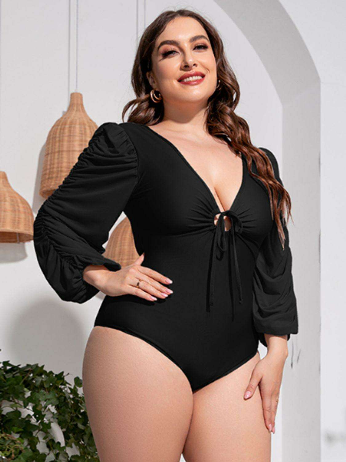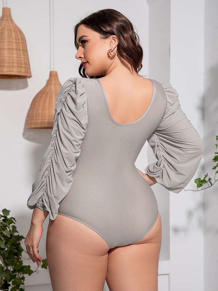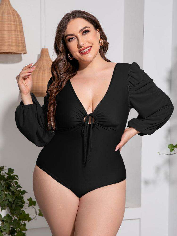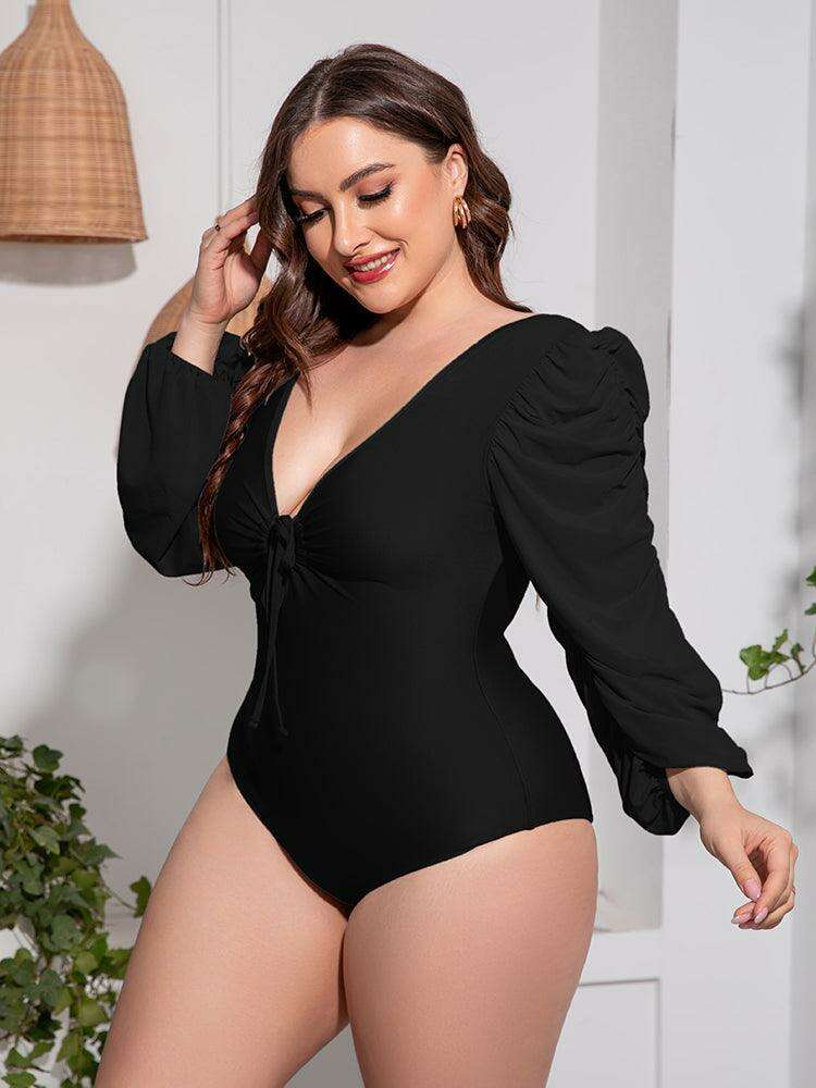 Stylish Plus Size One-Piece Swimsuit with Plunge Neckline and Balloon Sleeves