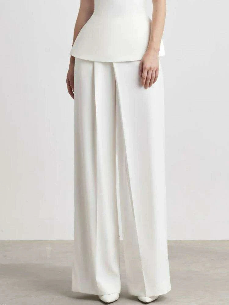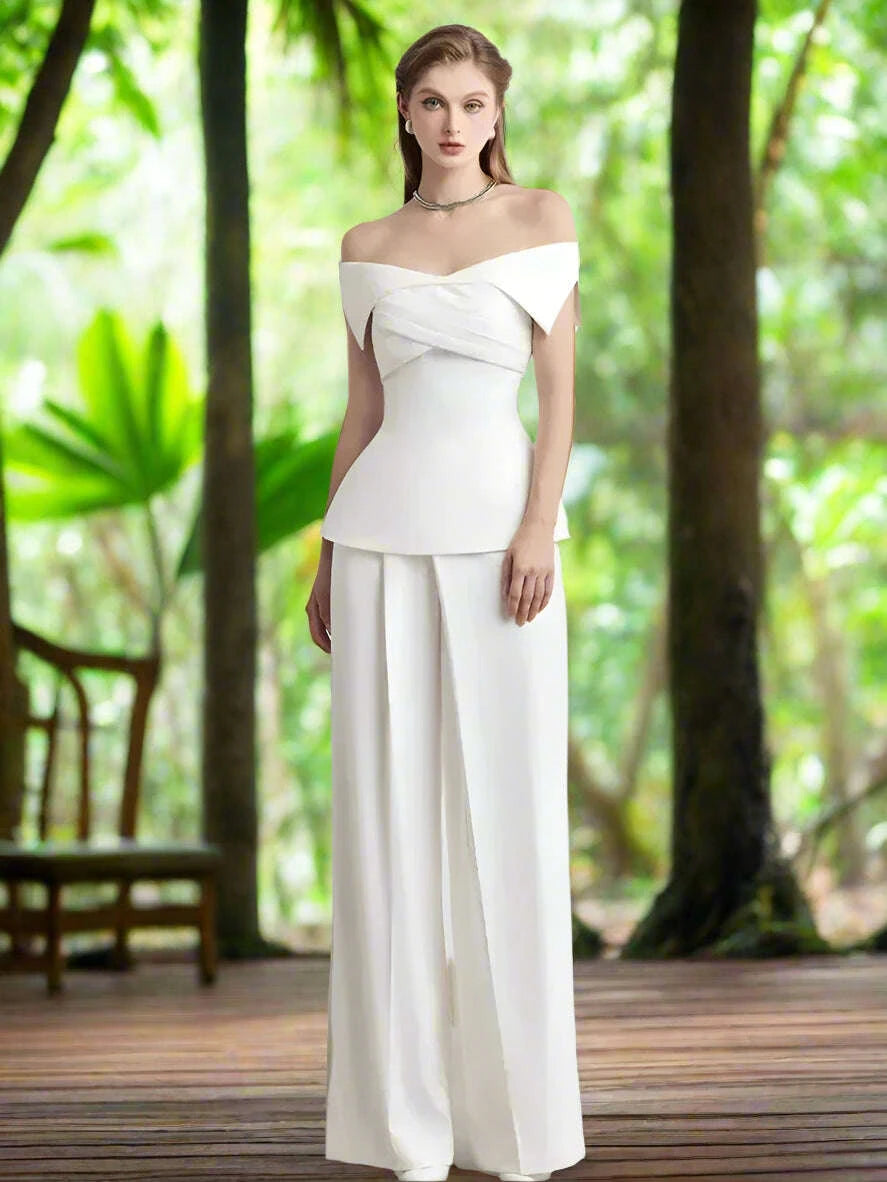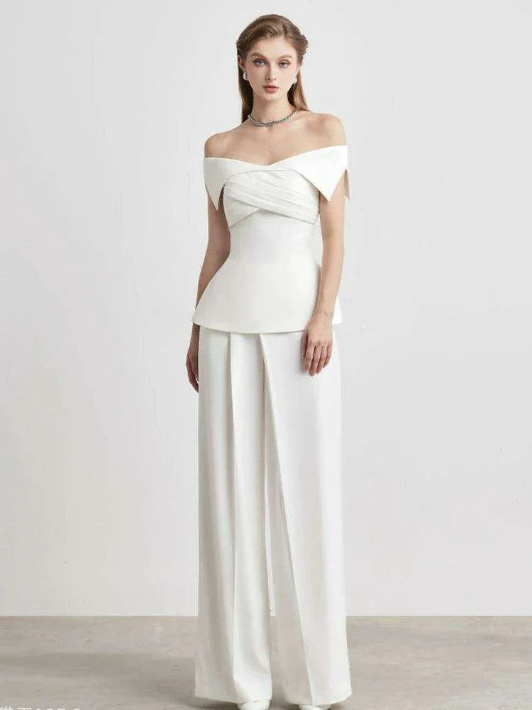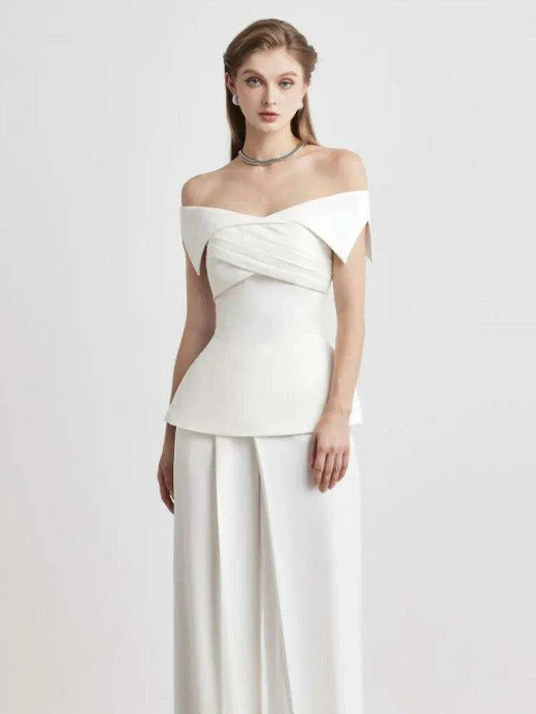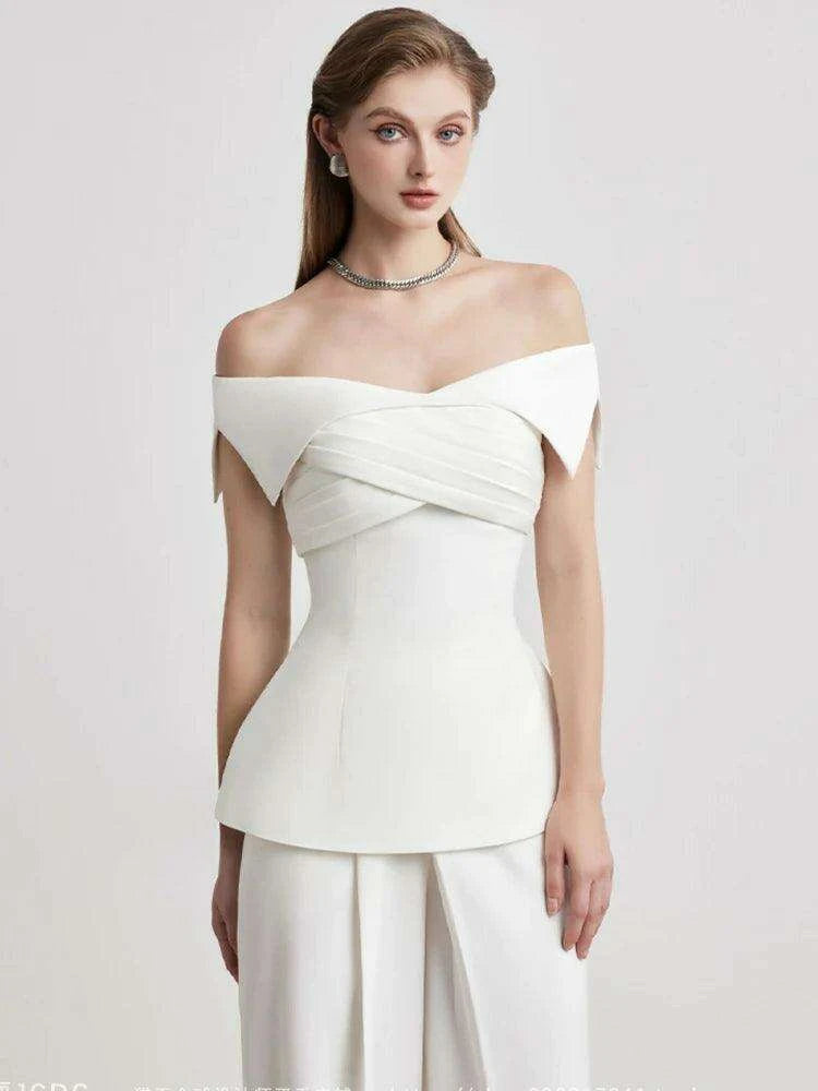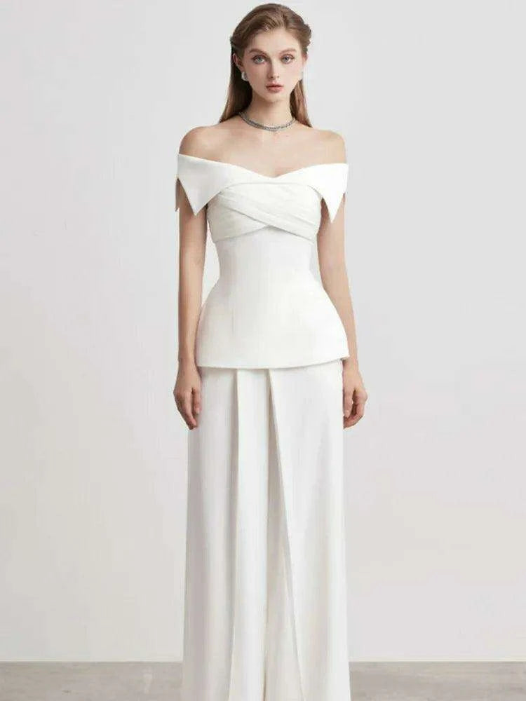 Summer 2-Piece Set with Off-Shoulder Neckline and Cross-Back Design - Pleated Jacket & Flowing Pants