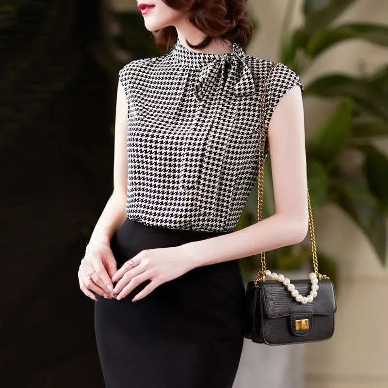 Blouse sans manches en mousseline de soie imprimée à carreaux d'été chic